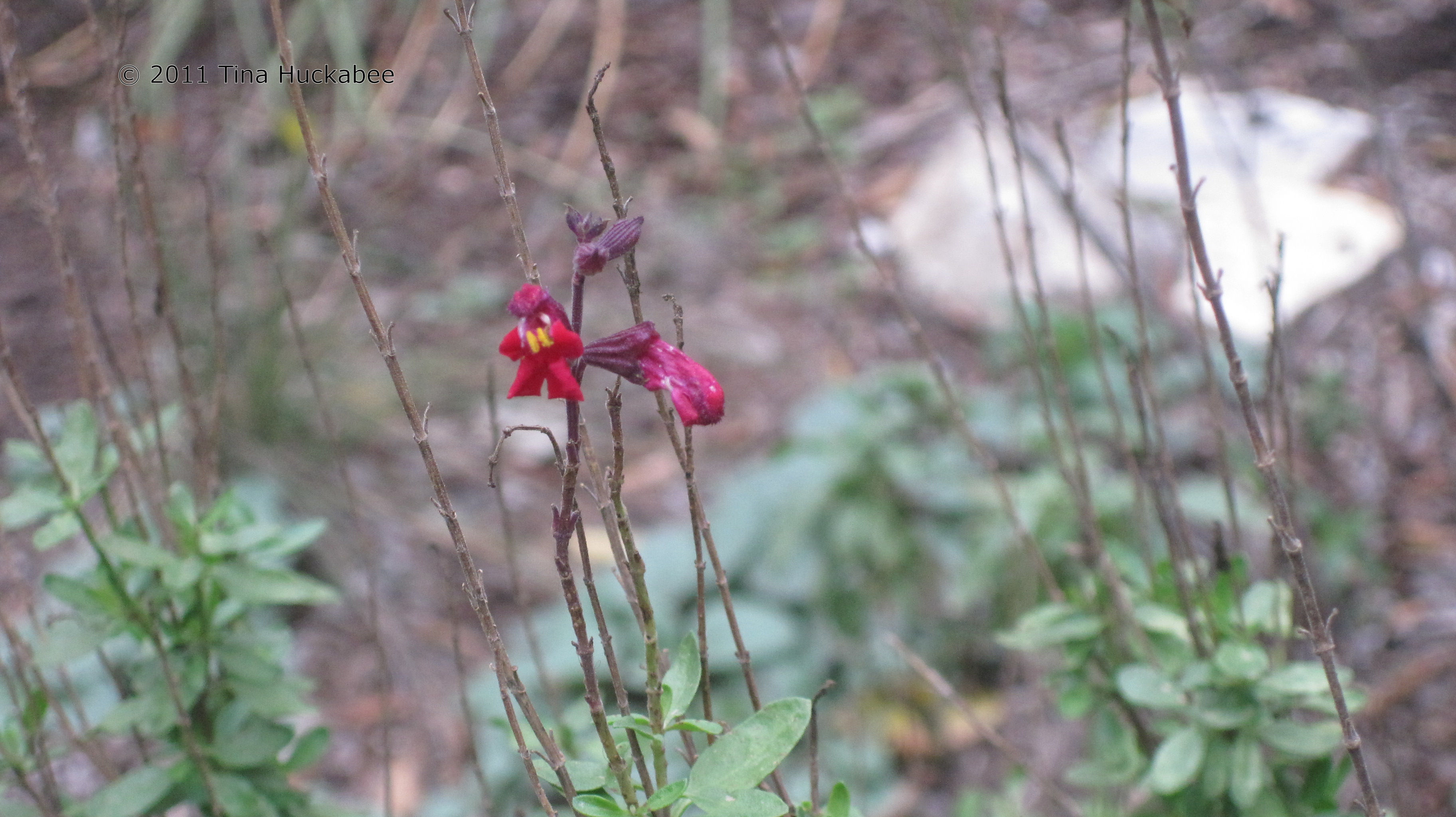 I found two healthy blooms on a Red Autumn Sage (Salvia greggii).  The one next to the healthy bloom is freeze damaged bloom.