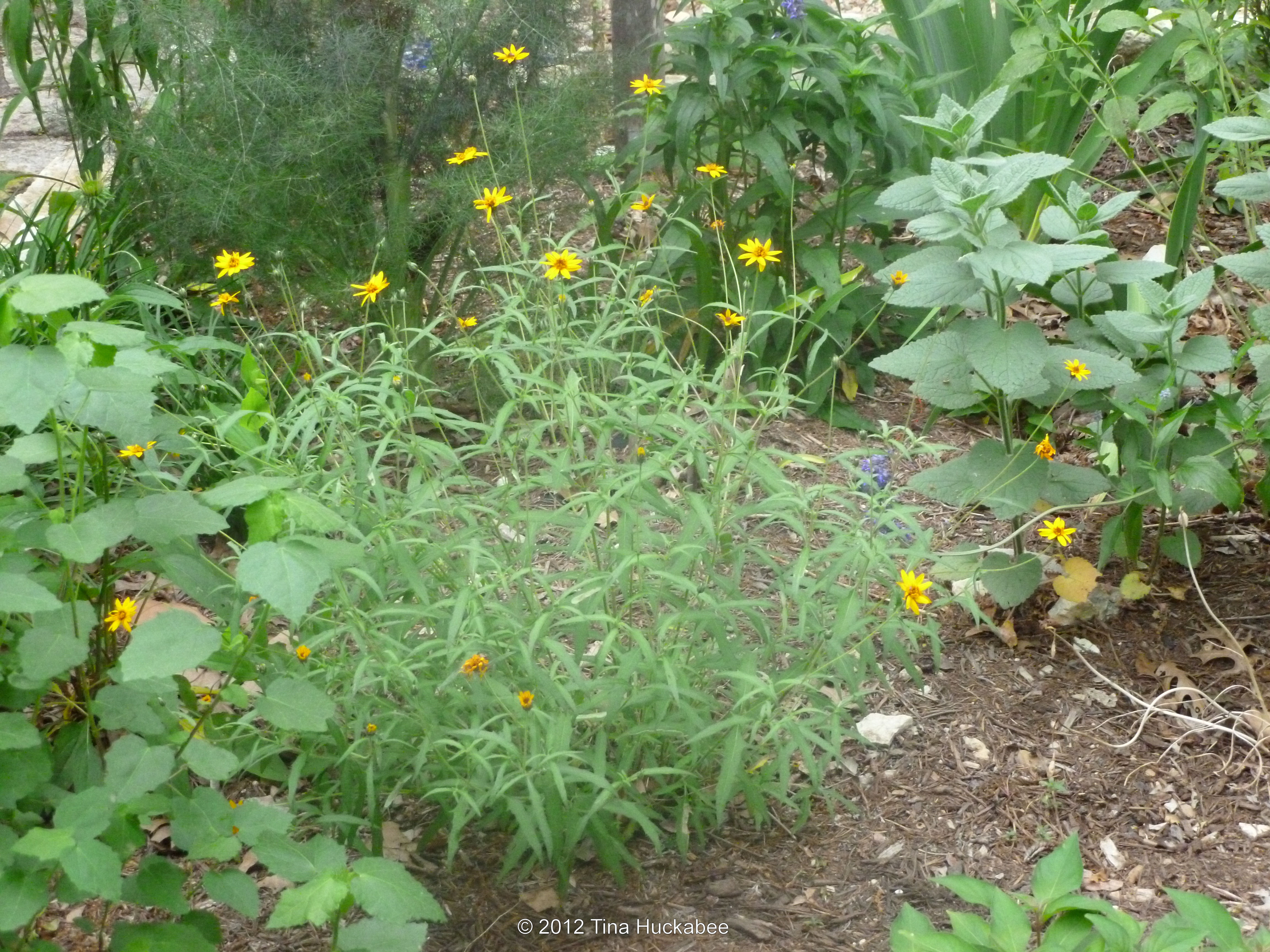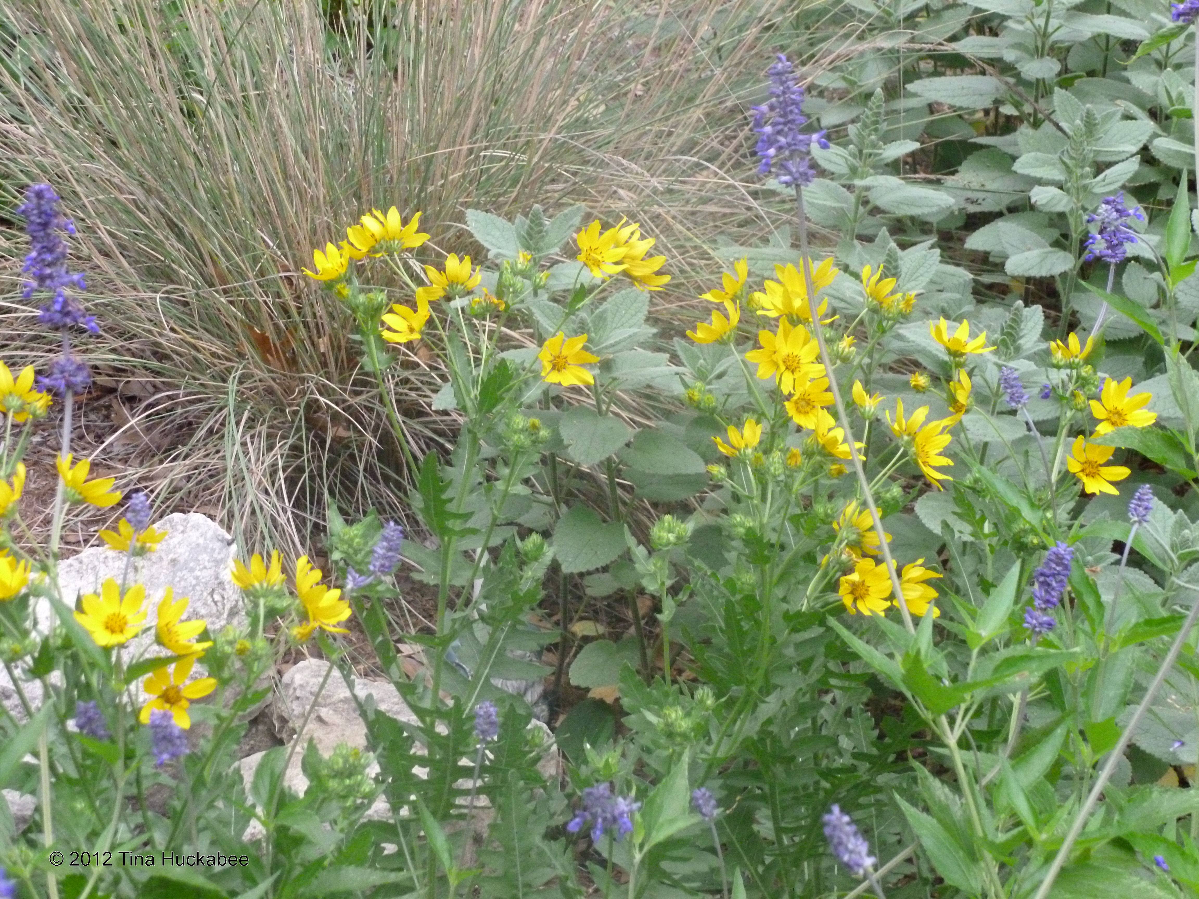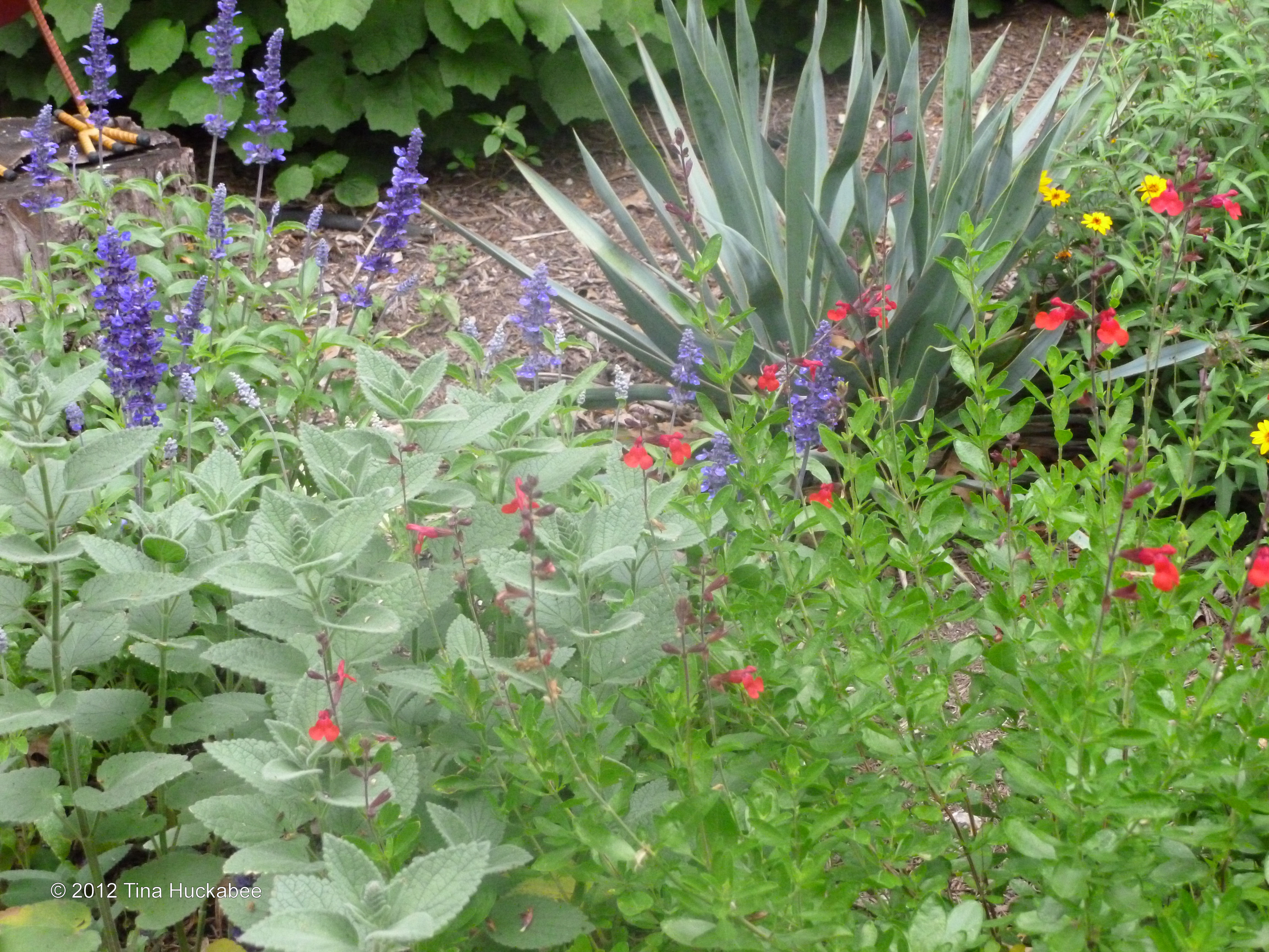 as is the original, more compact sage, the Mealy Blue Sage (Salvia farinacea).  These Mealy Blue Sage are planted with red Autumn Sage (Salvia greggii) and Zexmenia (Wedelia texana).