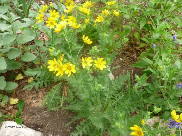 New to my gardens this year is the  Englemann’s  Daisy (Engelmannia peristenia).  Such a bright, cheery yellow and cool foliage to boot, it’s beloved by butterflies.