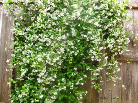 Finally, a childhood favorite, the non-native Star Jasmine (Trachelospermum jasminoides).  I grew up calling it Confederate Jasmine.  My mother had it planted  in her gardens, along with several kinds of passion-flower vine.  Its beautiful fragrance fills the air–morning, noon and night for a month or so.  Like my mother, I have a number of these lovelies throughout my gardens.