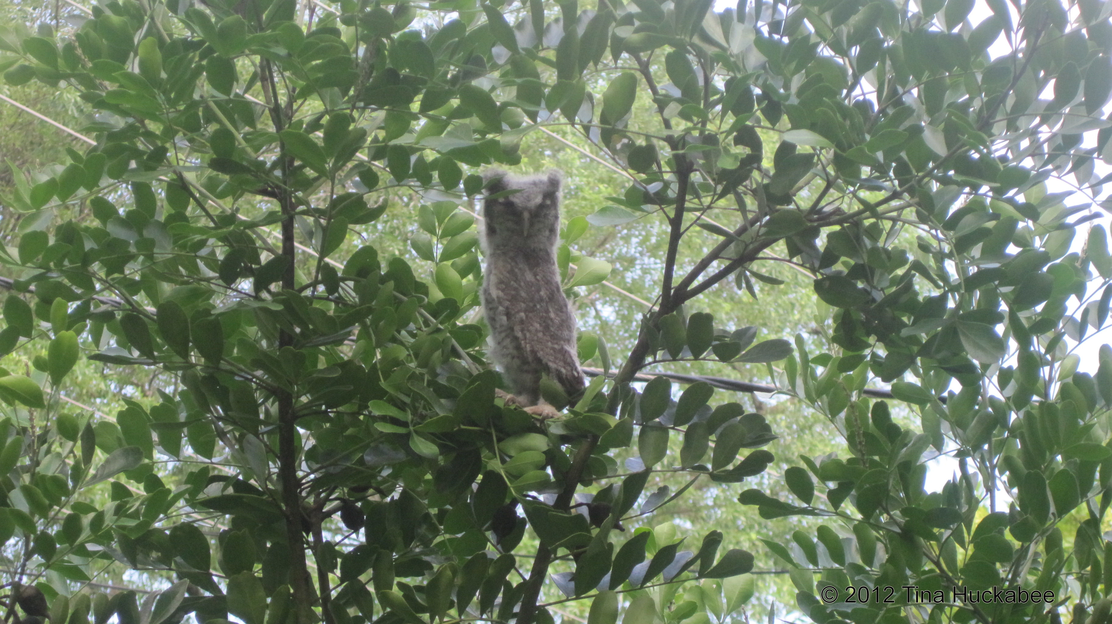 This is one of the four owlets from two years ago, just after they left the house. All of them roosted in a Mountain Laurel for a few days.