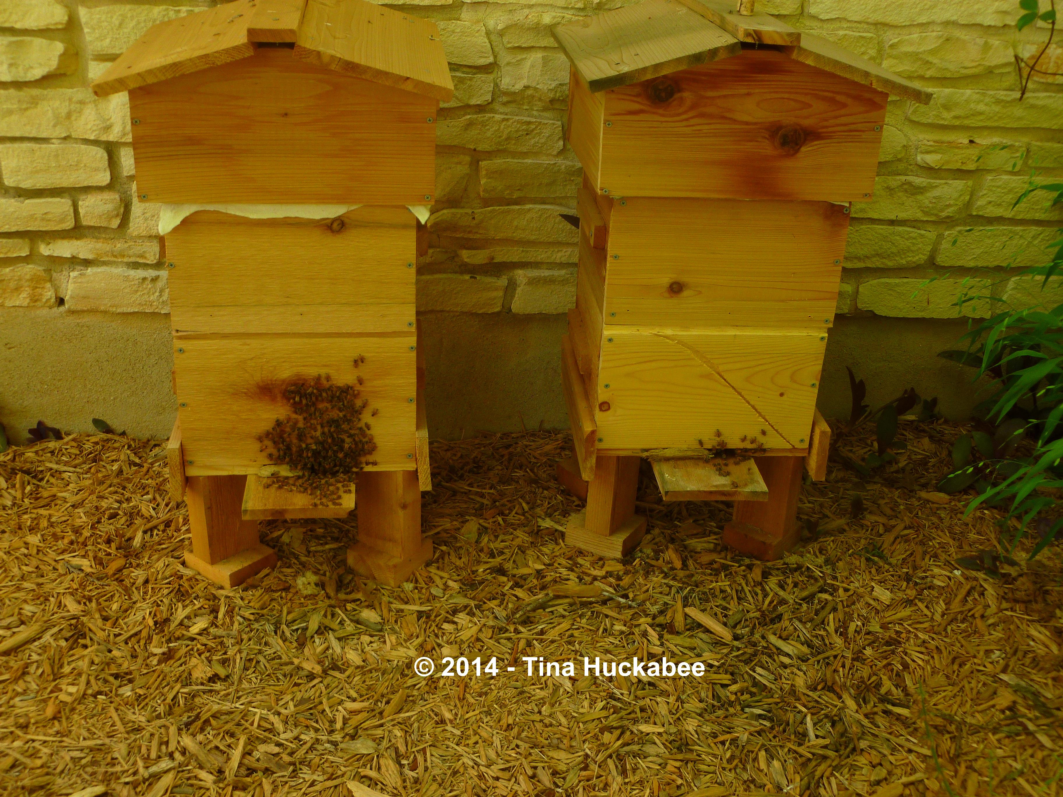 About three weeks ago, we added a second box to both hives because our industrious bees completely filled the bottom box with drawn comb.