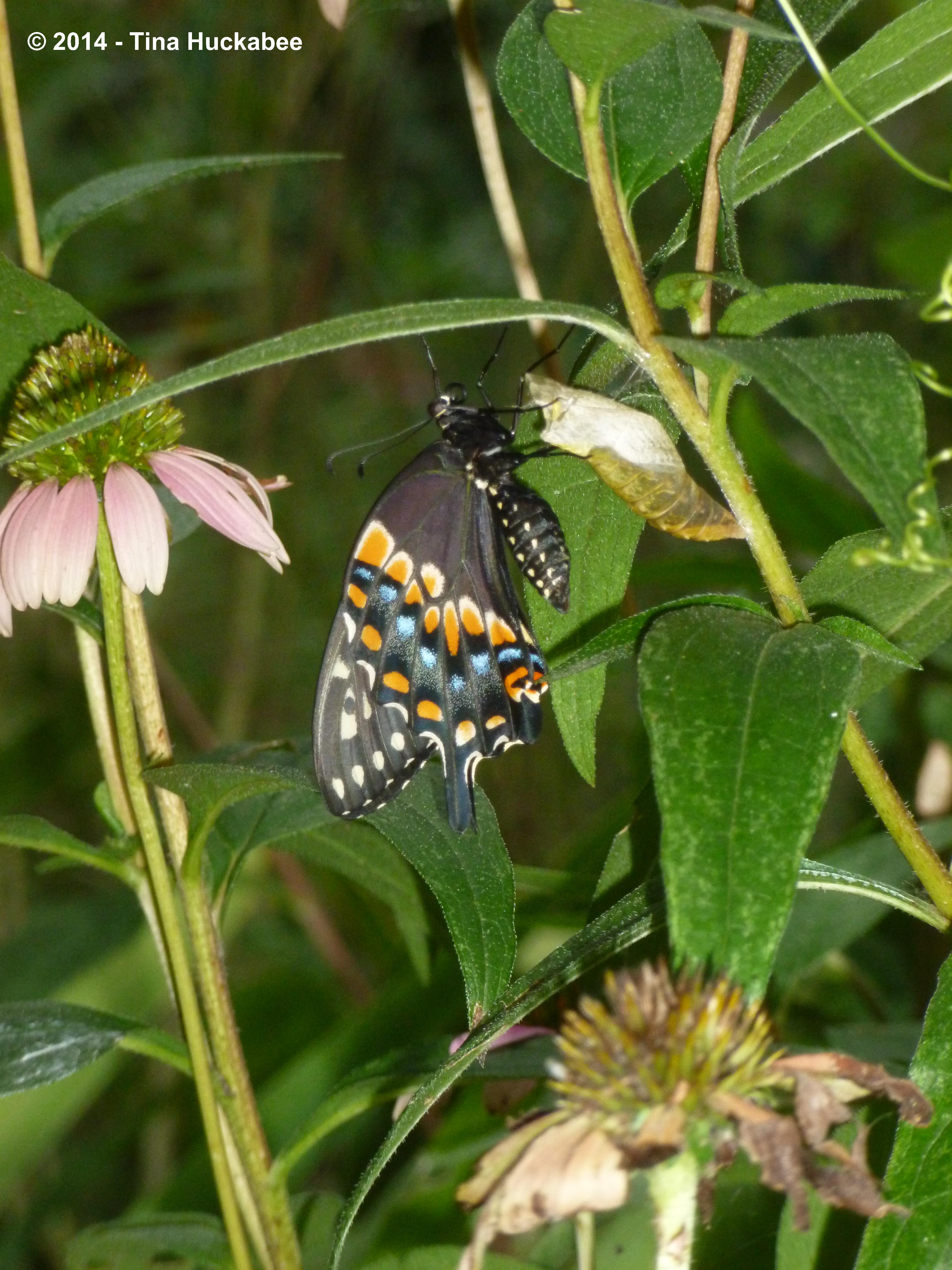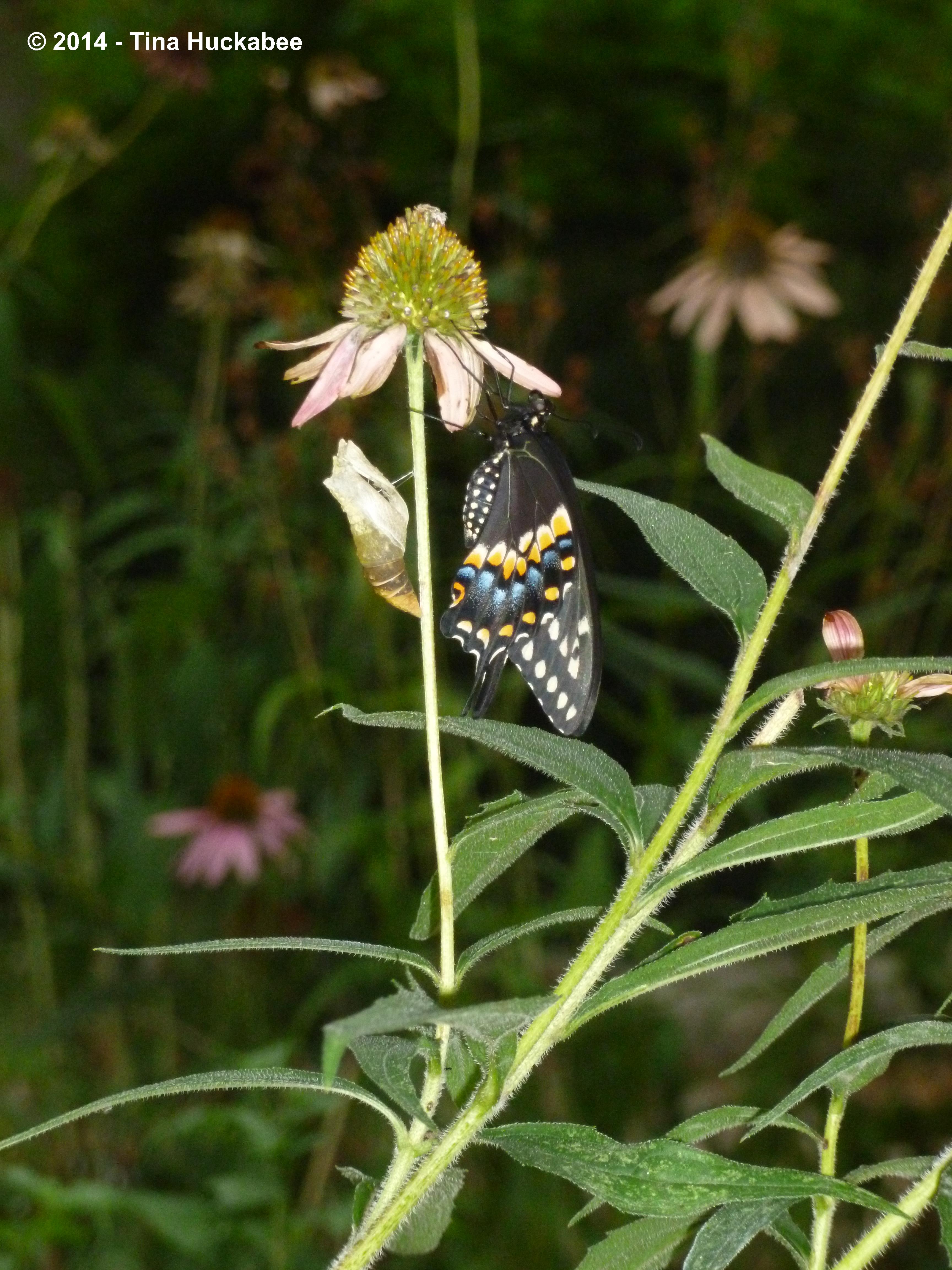Observing these two adult butterflies emerging from their transitional homes gently reminded me that it’s okay, indeed preferable, not to prune plants just because they’re a little worse for wear. The Coneflowers in my gardens are setting seed and are no longer fresh, pink and pretty. I’m glad I wasn’t keen to prune them to the ground, because I would have destroyed the anchor for the butterflies’ chrysalides.