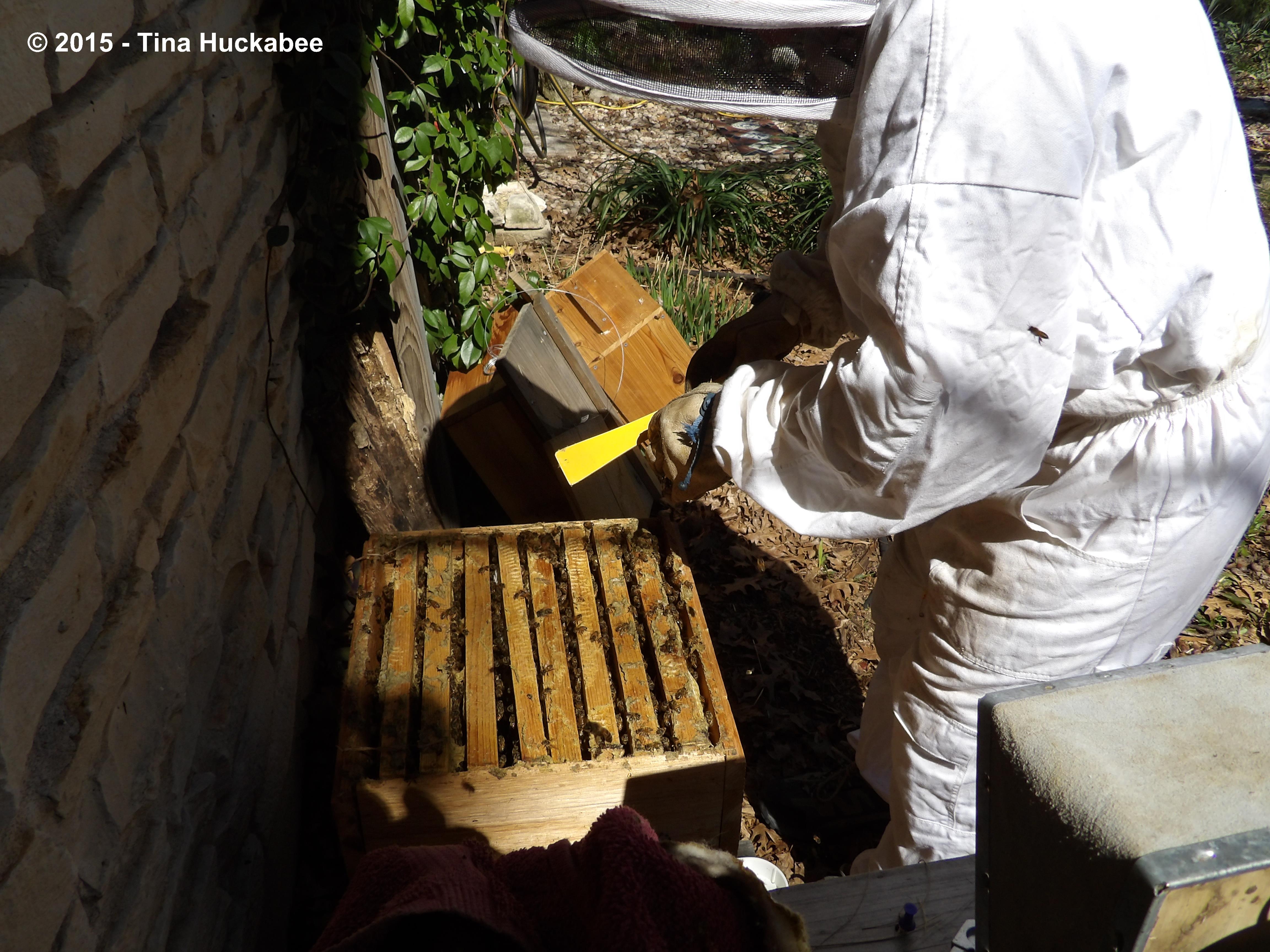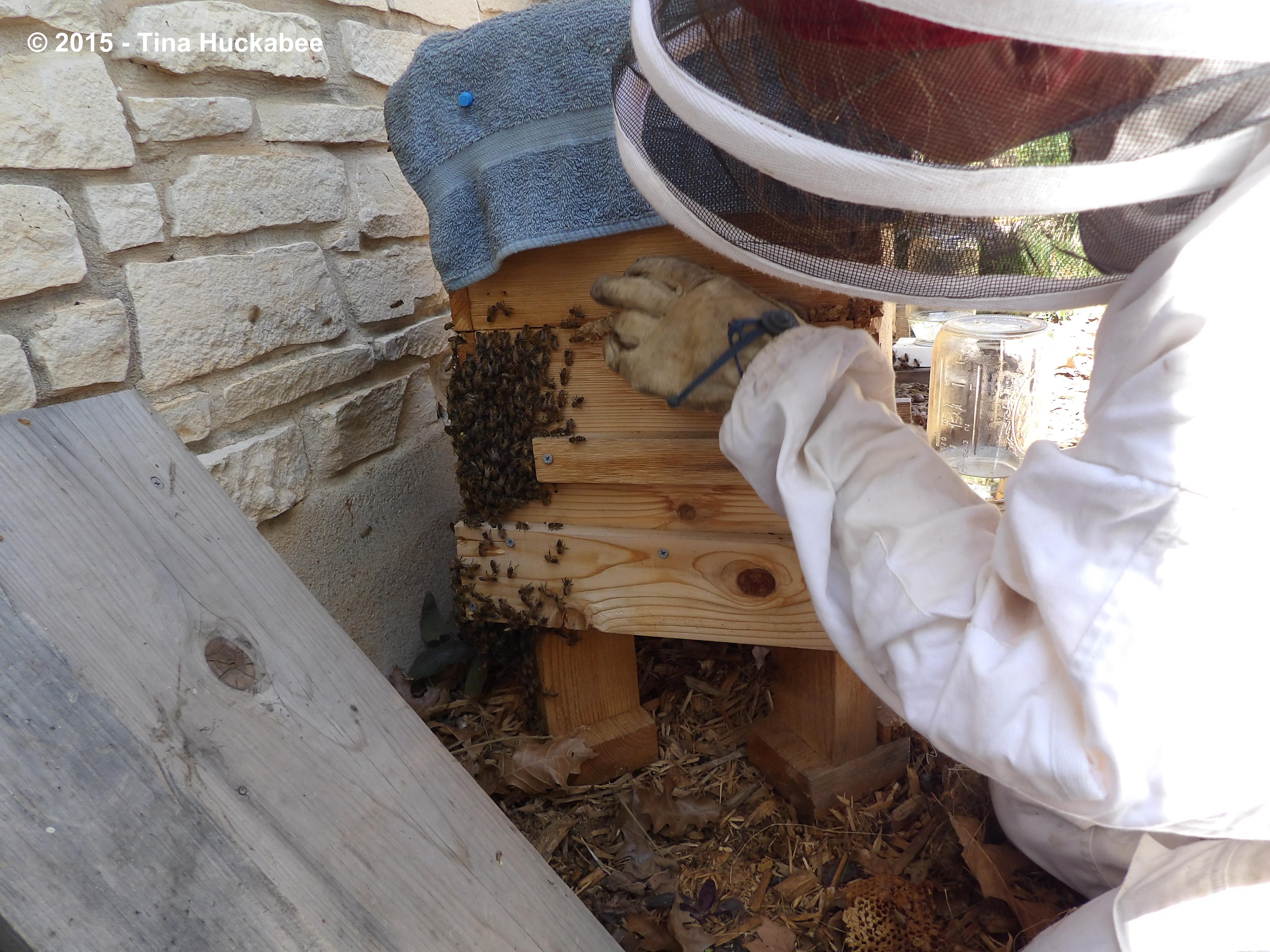 Bee Daddy readied the drill and the deconstruction began. I thought the noise of the drill would annoy the girls, but they were well smoked and laid back. The front came off with no problems.