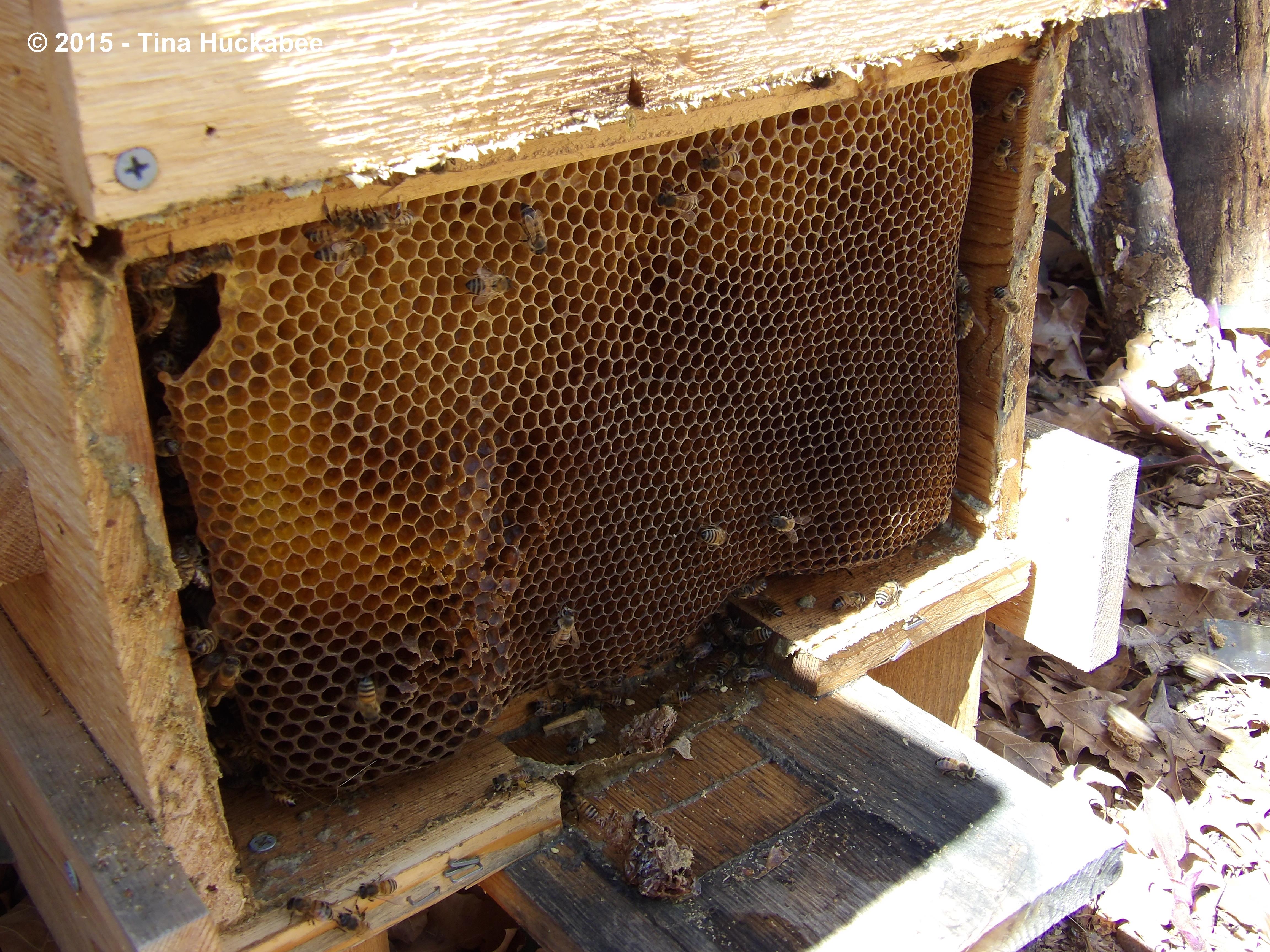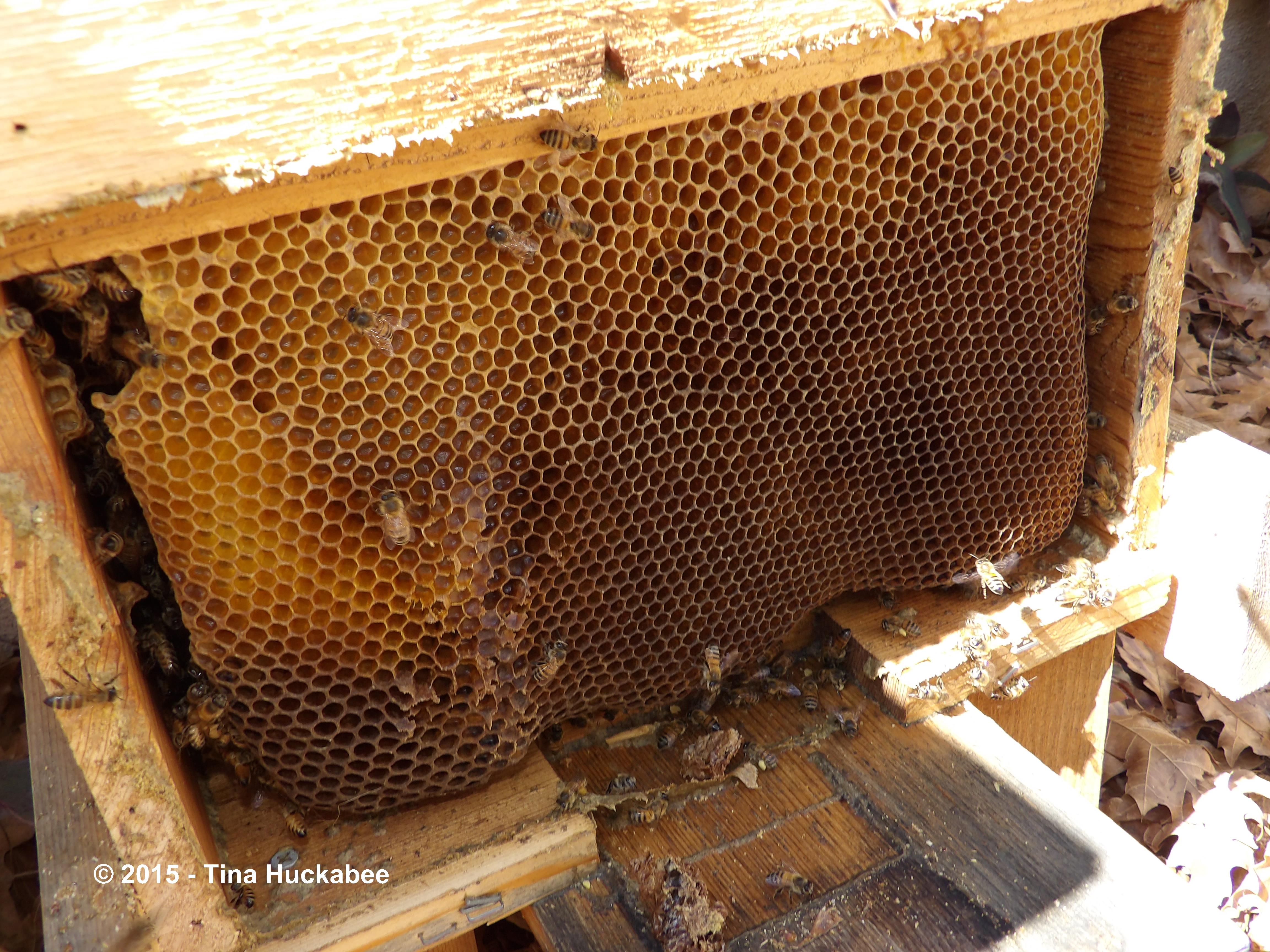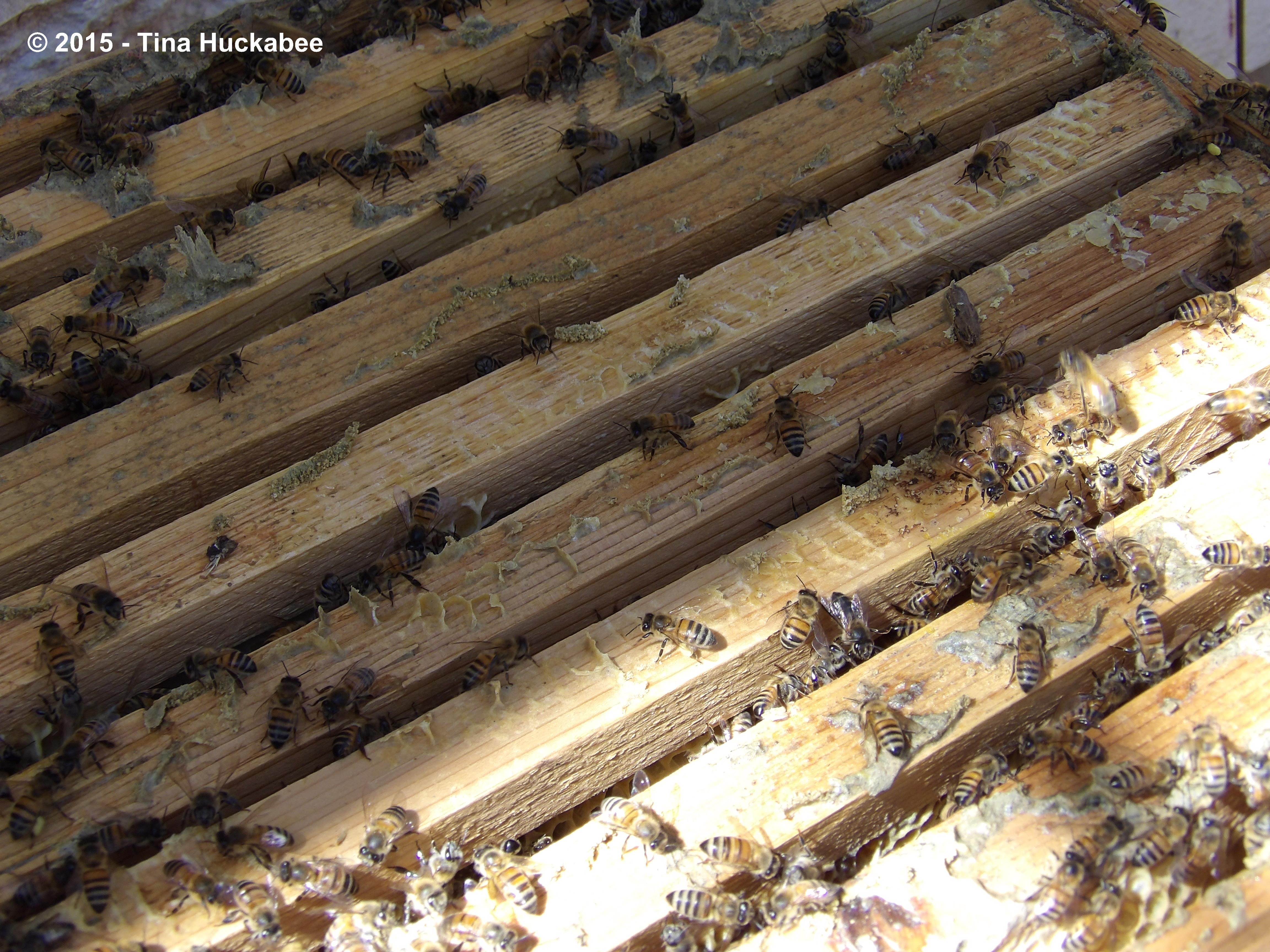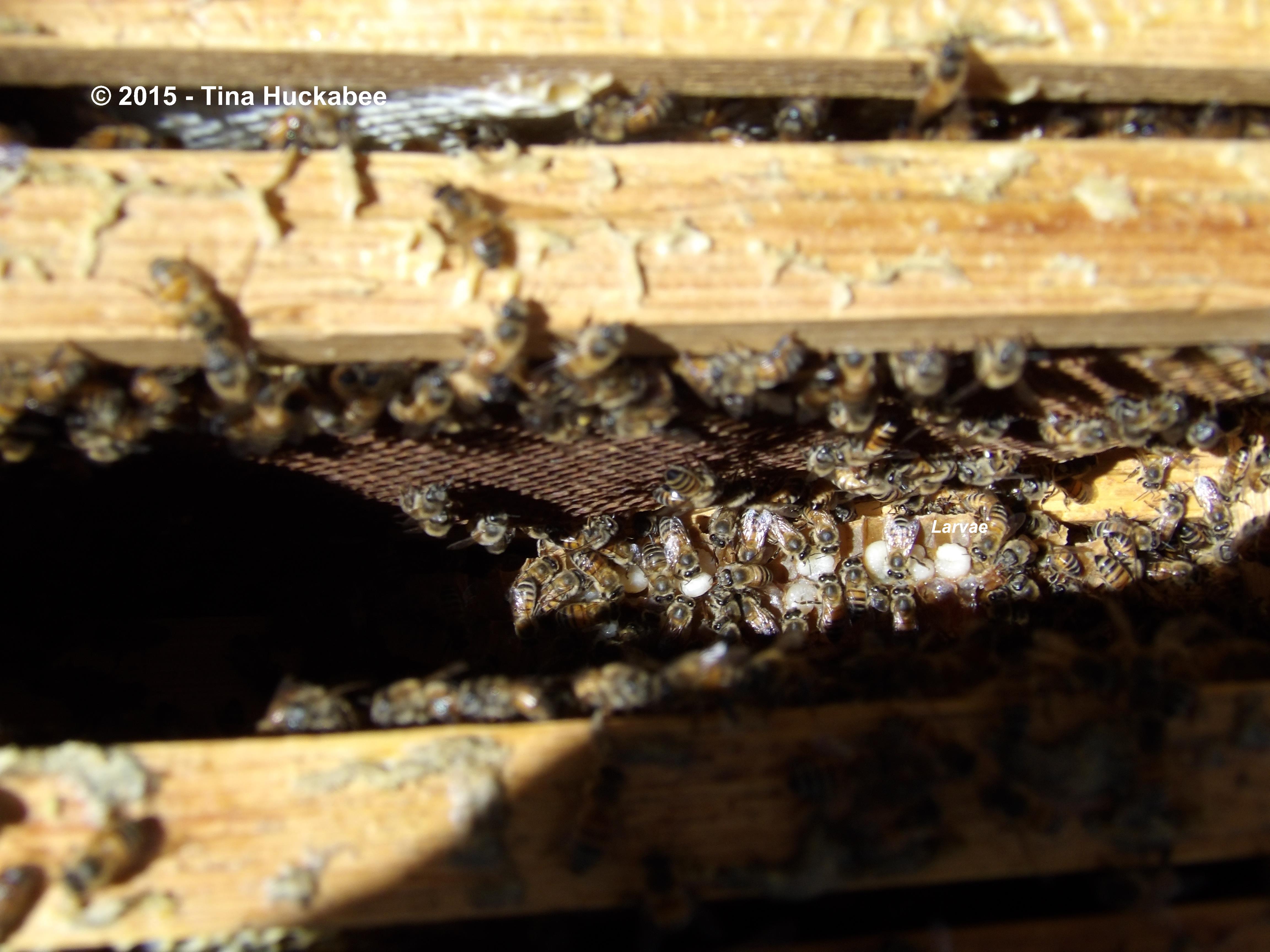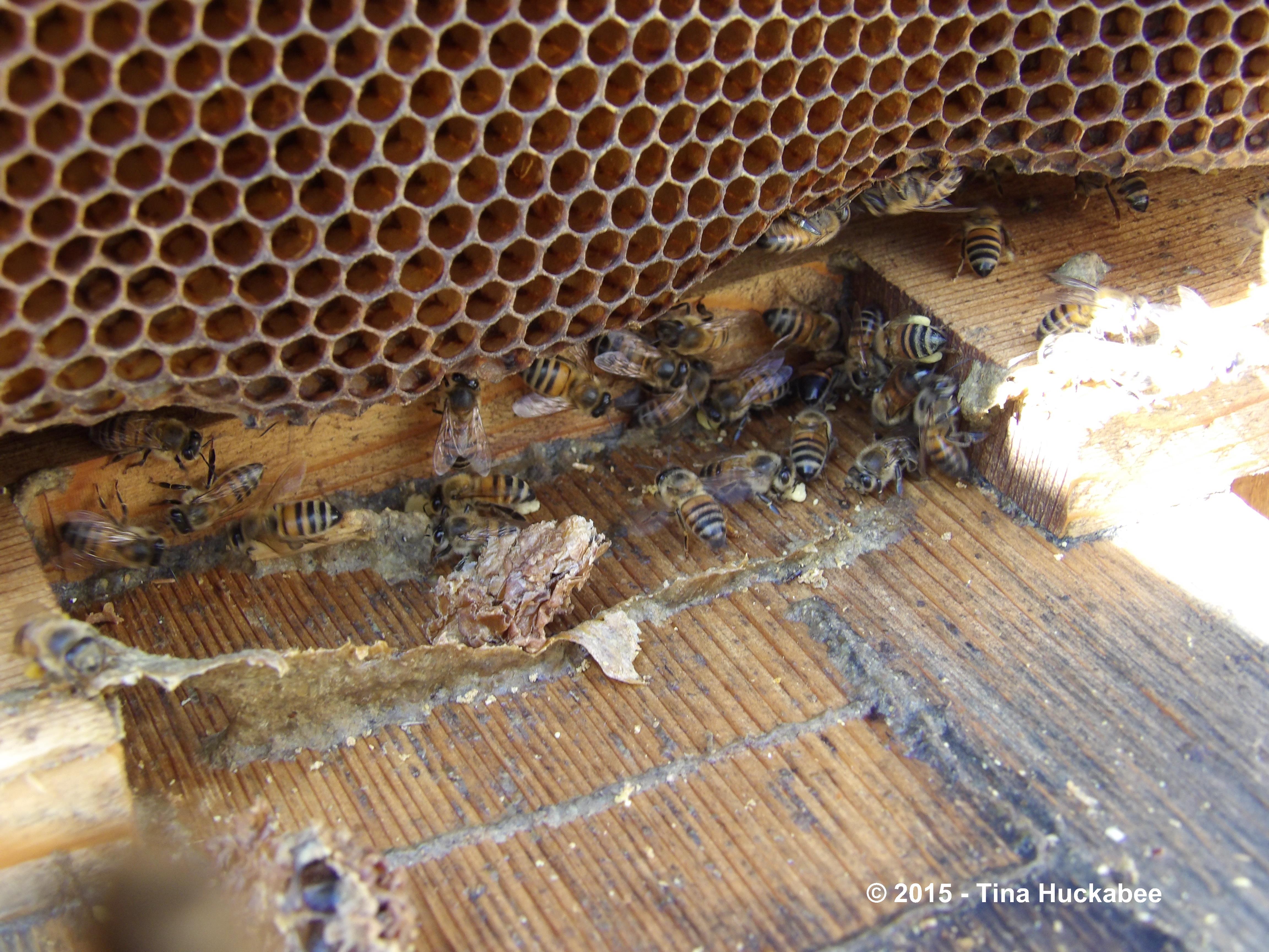 Unfortunately, sometimes as I pull the top-bars up and out for inspection, the comb breaks. Here you can see some newly exposed larvae (little white blobs) within a broken comb.