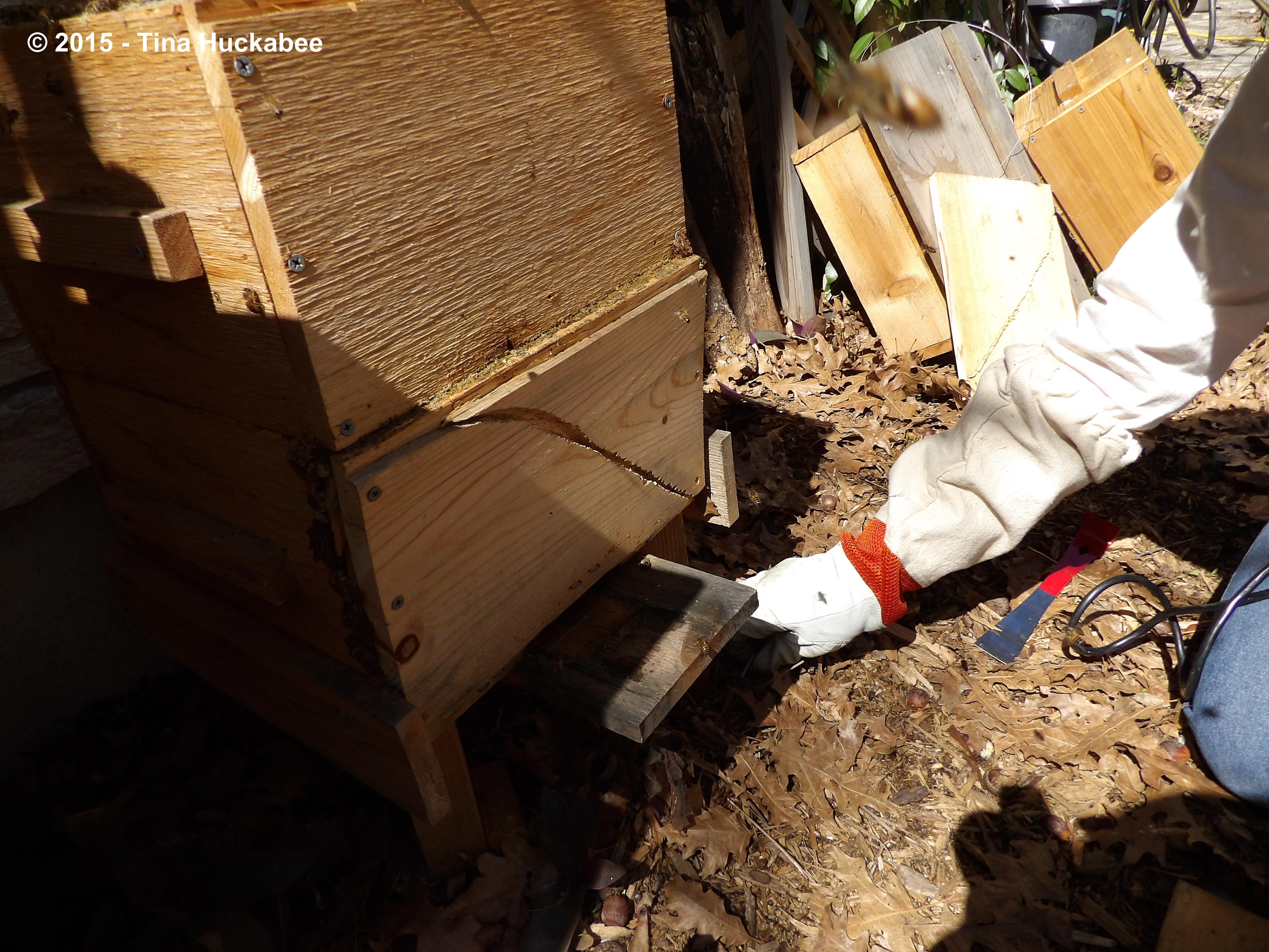 As the hive was two years old before we hived our honeybees a year ago, the wood is now three years old and has been out in the elements for a bit of that time; it’s showing some wear. The hive is made of cedar, which weathers beautifully, but the wood piece in question, a practice piece of sorts, is pine and damage and warped. It began to pull away from the box above it, potentially exposing the inside of Scar’s hive. If not for the dutiful and exact work of the bees to seal any openings with propolis and my stuffing the on again/off again emerging crack with comb that we’ve harvested, our little Scar bees wouldn’t have been as cozy and safe in their hive during the last part of winter.