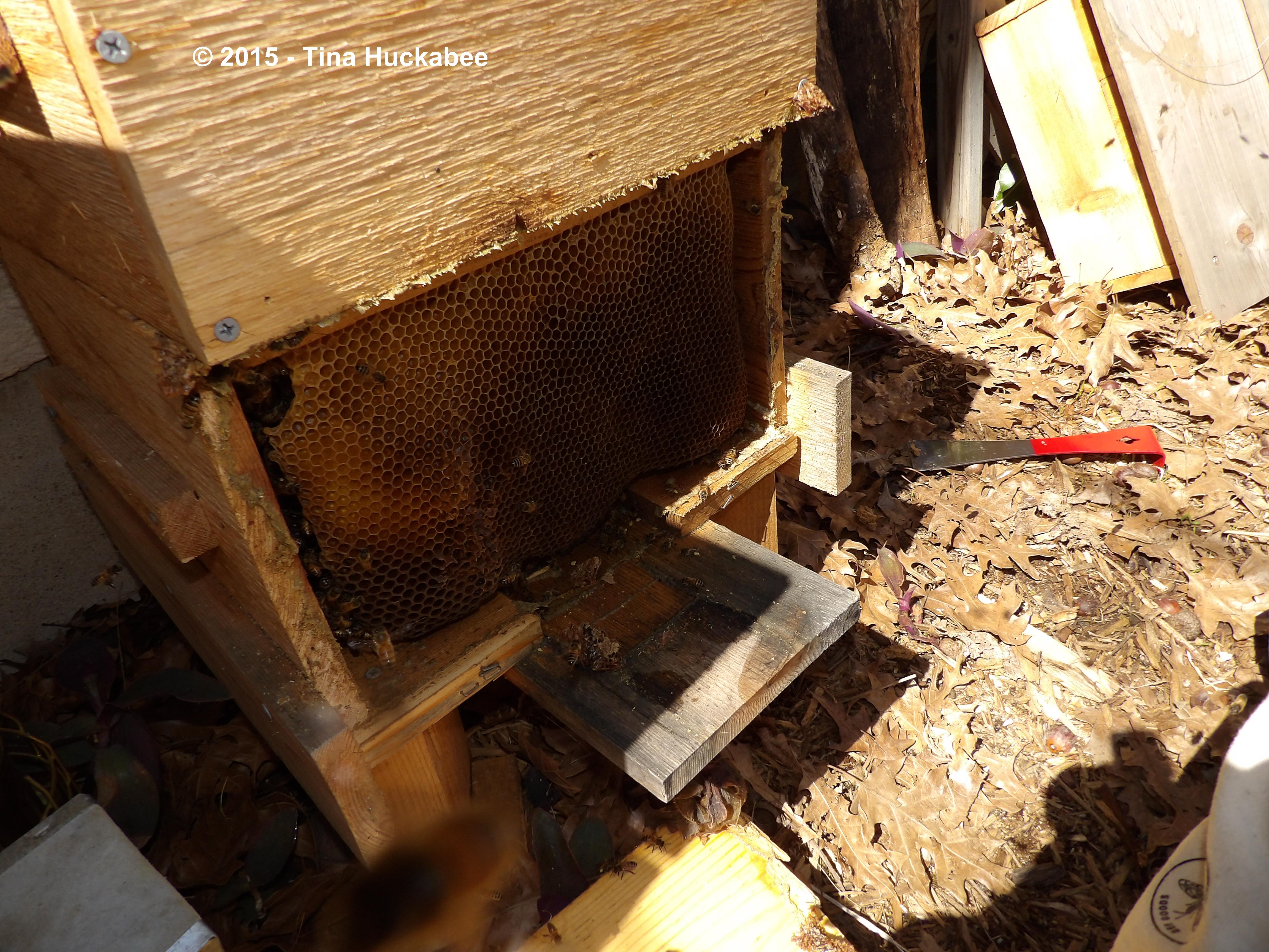 I believe I mentioned the odd sense of humor my beekeeping partner has? He decided that before attaching the new piece of wood to the hive, to recreate a scar in the wood.