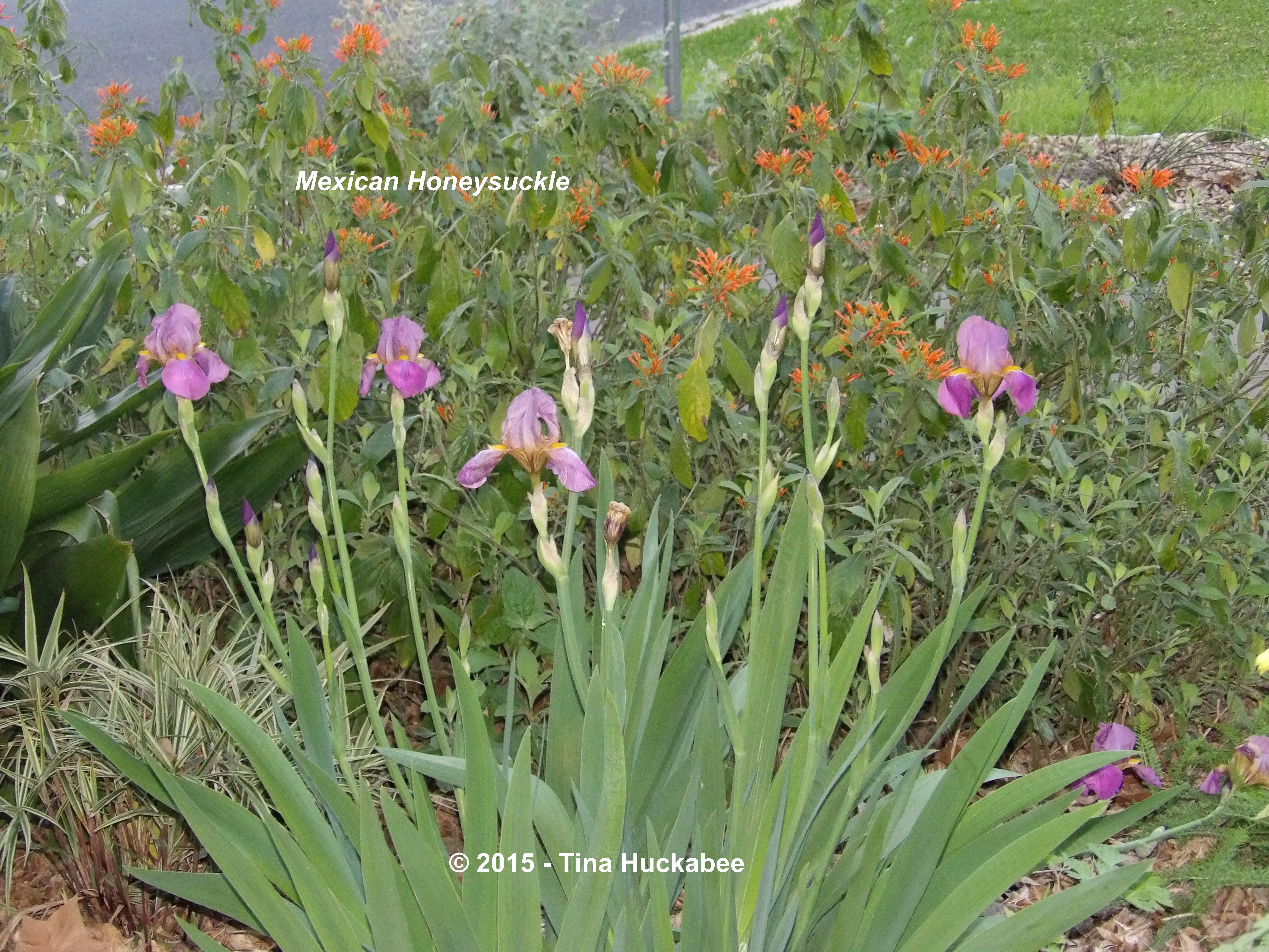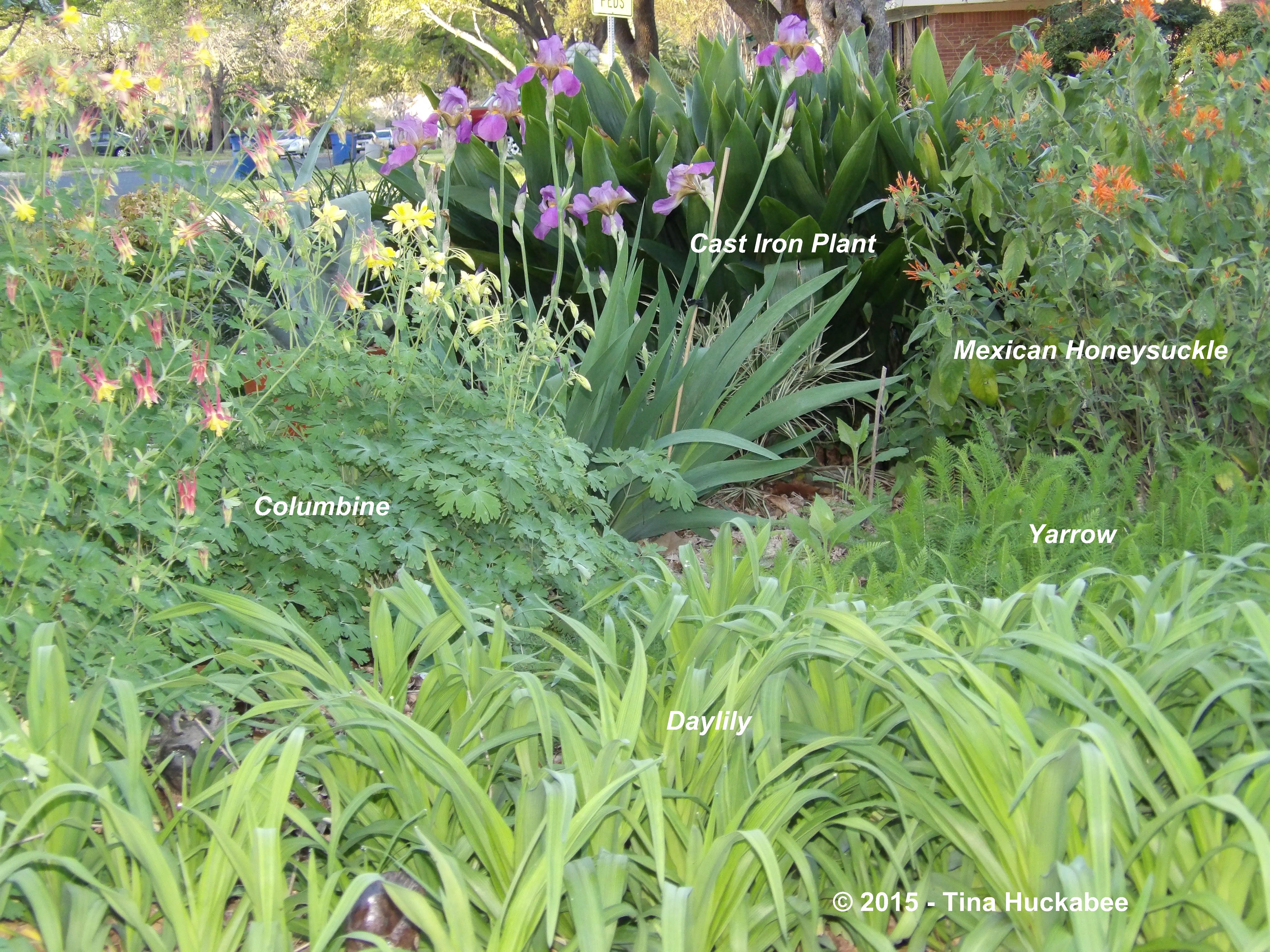 Here it is dancing with other spring bloomers like Columbines, Aquilegia and Mexican Honeysuckle, Justicia spicigera. Also in the photo are the not-yet-in-bloom  orange daylily and Yarrow, Achillea, with a backdrop of Cast Iron Plant, Aspidistra elatior.IMGP6575.new