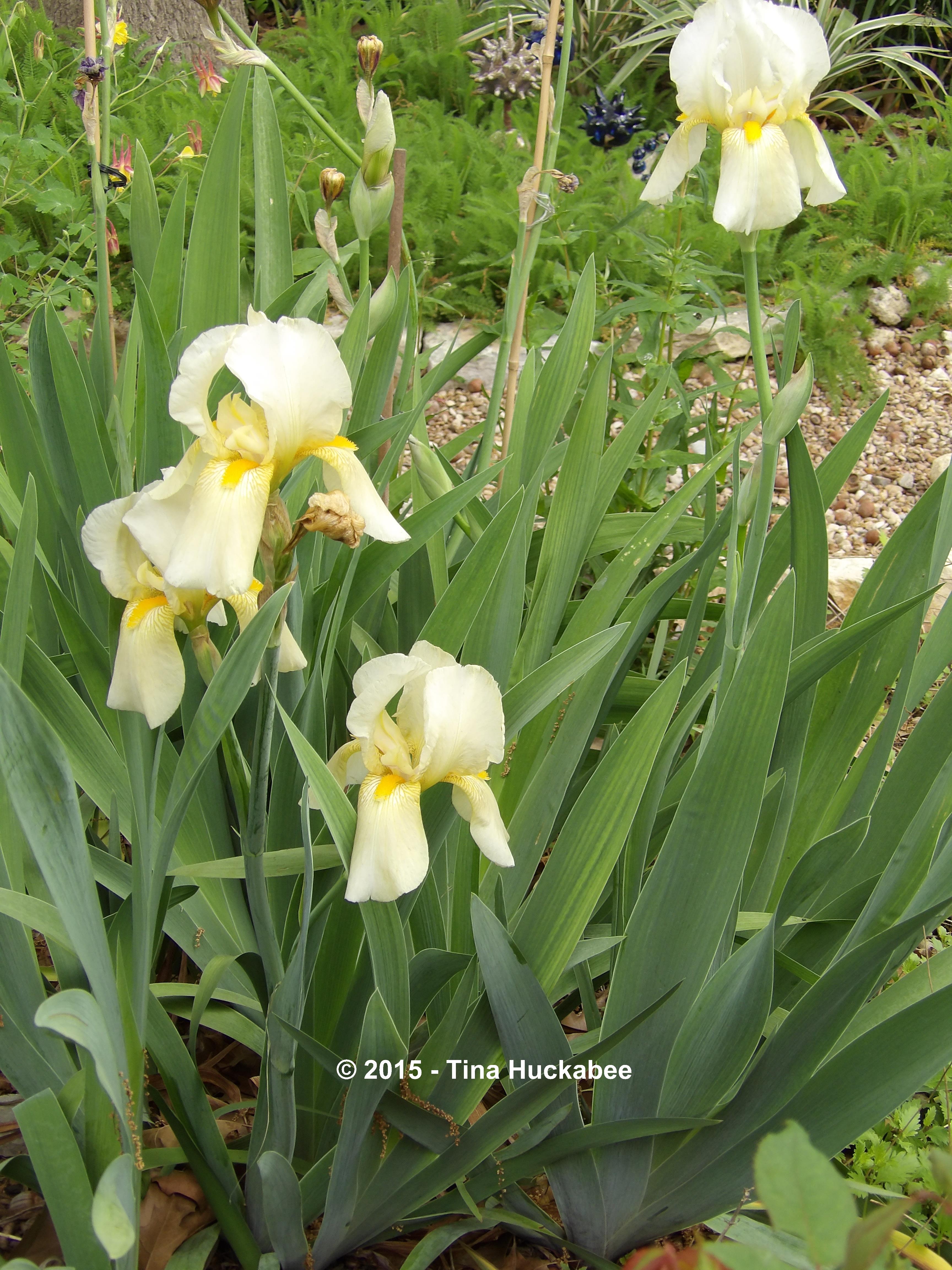 I don’t know the name of this iris or the other iris varieties in my gardens. I have researched information in an attempt to learn the iris names, leafing through books and scrolling online, but there are so many iris varieties and just similar looking enough to one another, that I gave up exact identifications.  While I like to know the names of the plants in my gardens, I’m not an expert at iris identification–that’s a study unto itself and not a body of knowledge I can lay claim to.  I content myself with simply enjoying these garden gifts:  I anticipate and revel in stunning iris flowers  each spring, appreciate their hardiness during our hot summers, and value their evergreen habit in winter.