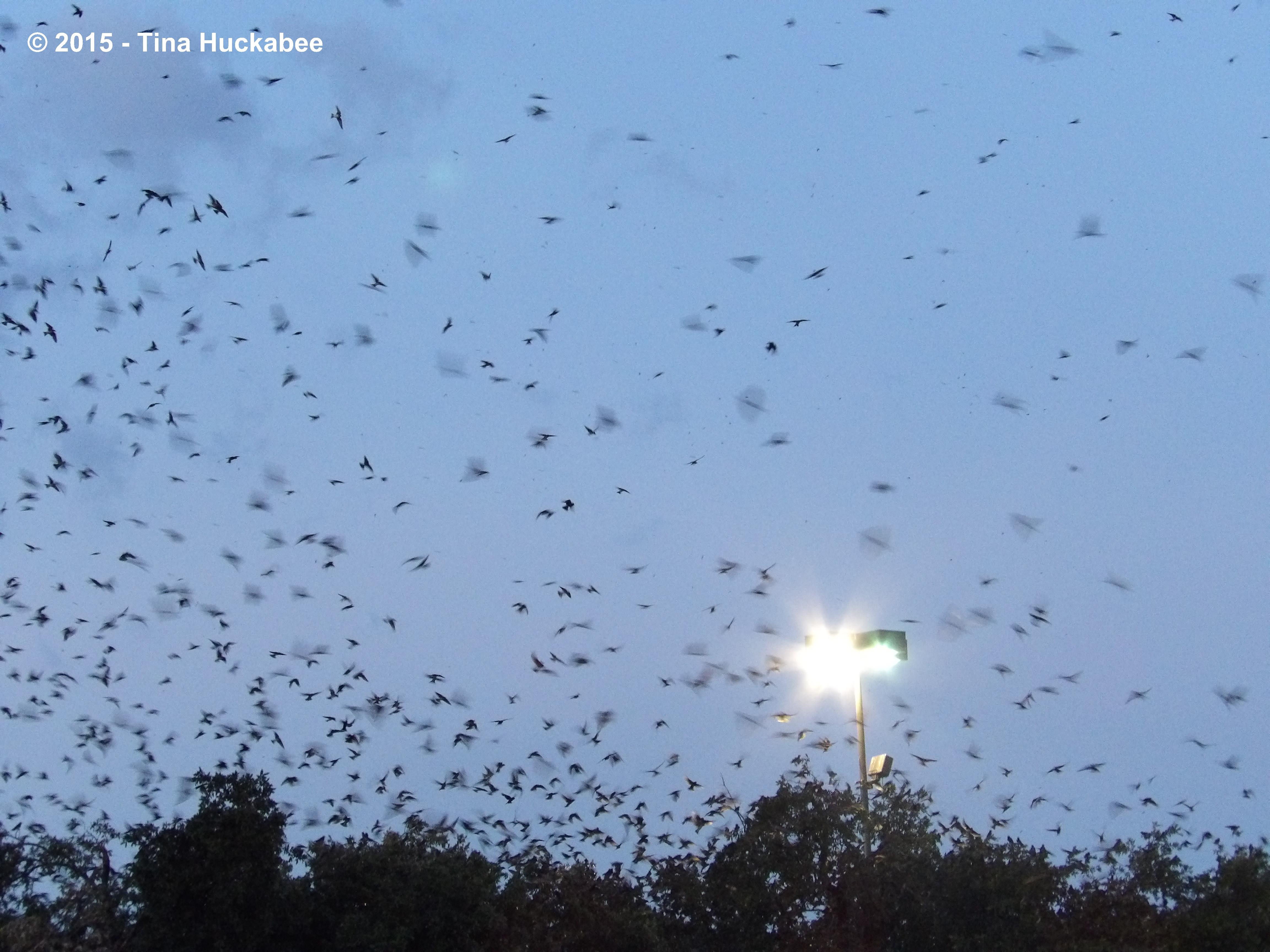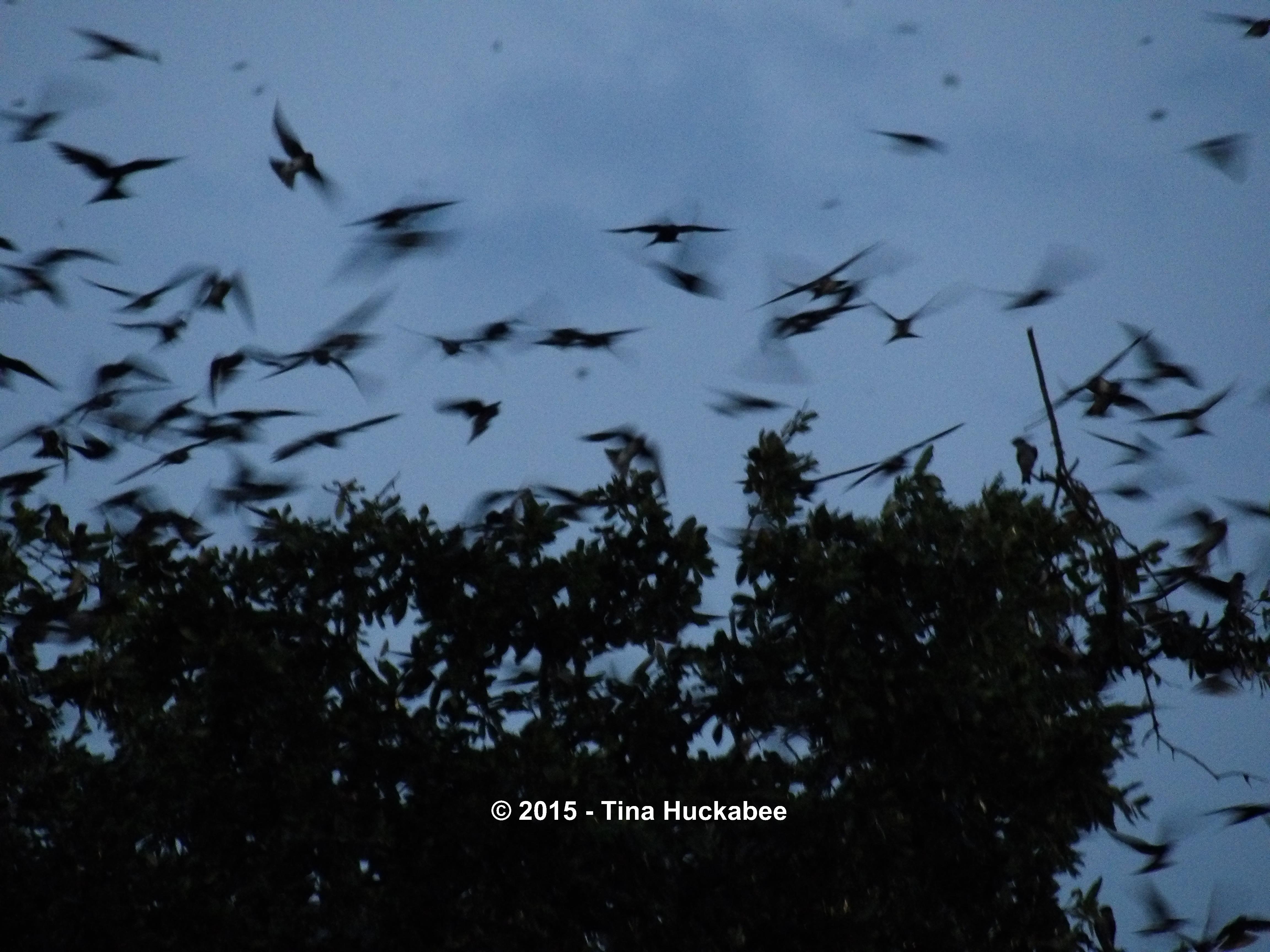 As more birds gather, they swoop and sway in the air and by sundown, many are perched in the trees for the night.