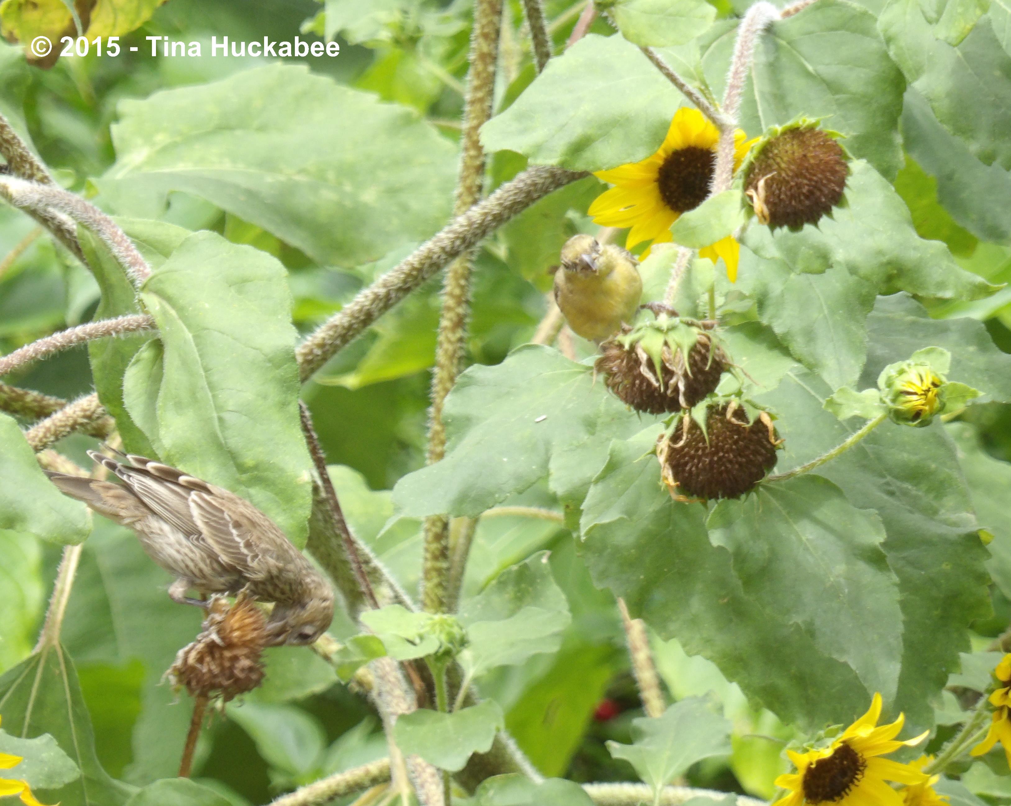 Feeding on the going-to-seed sunflowers are the Lesser GoldfinchSpinus psaltria, gang–boys and girls alike.