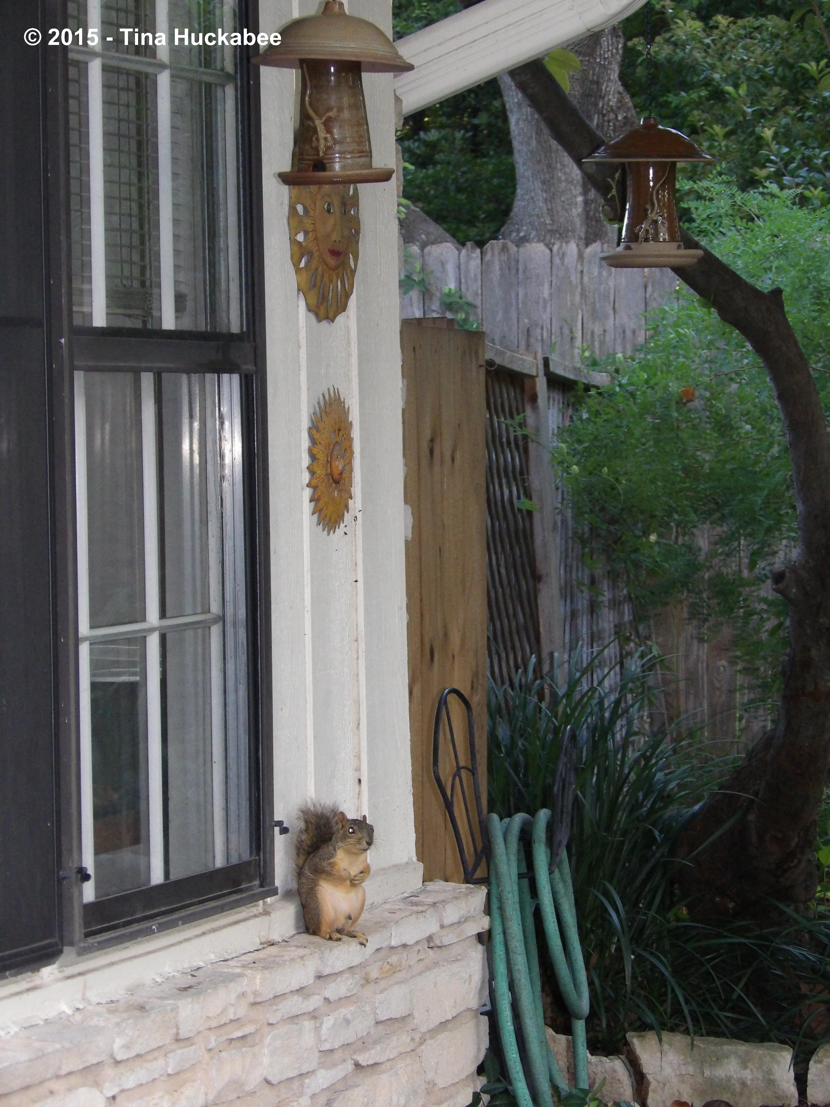 The squirrels are not happy with me. I don’t always fill the bird feeders, but I am this summer. By default and population, I’m also feeding the squirrels.   Several of these enterprising rodents began climbing up and then hanging onto the solar screen while nibbling seeds at the ceramic feeder in front of the kitchen window. They were emptying this feeder in front of the kitchen window in less than a day.  NOT cool. I finally removed the screen, to their great frustration.  Since then, the screen-vanquished squirrels have tried, in vain, to figure out how to get to the feeder.