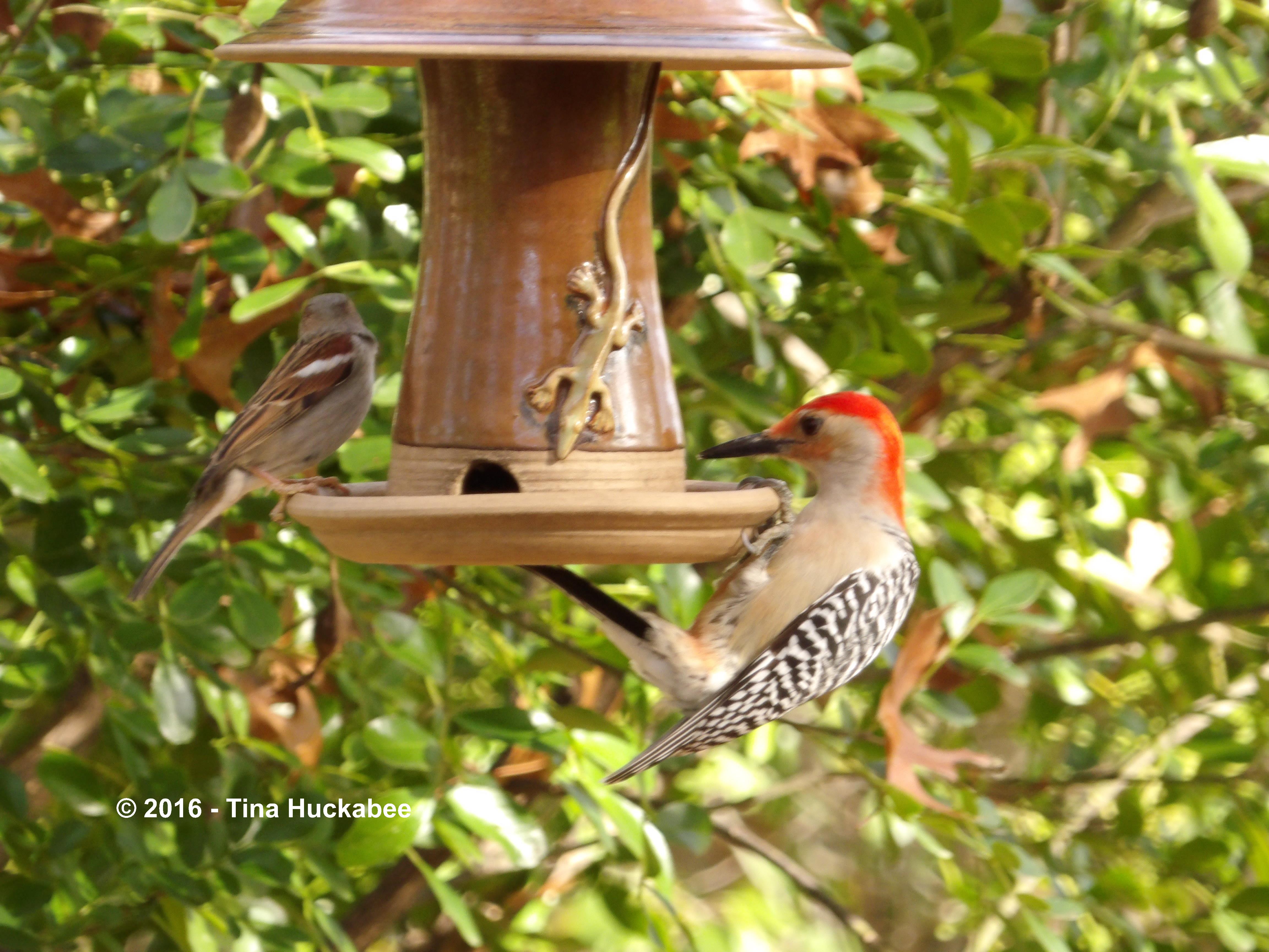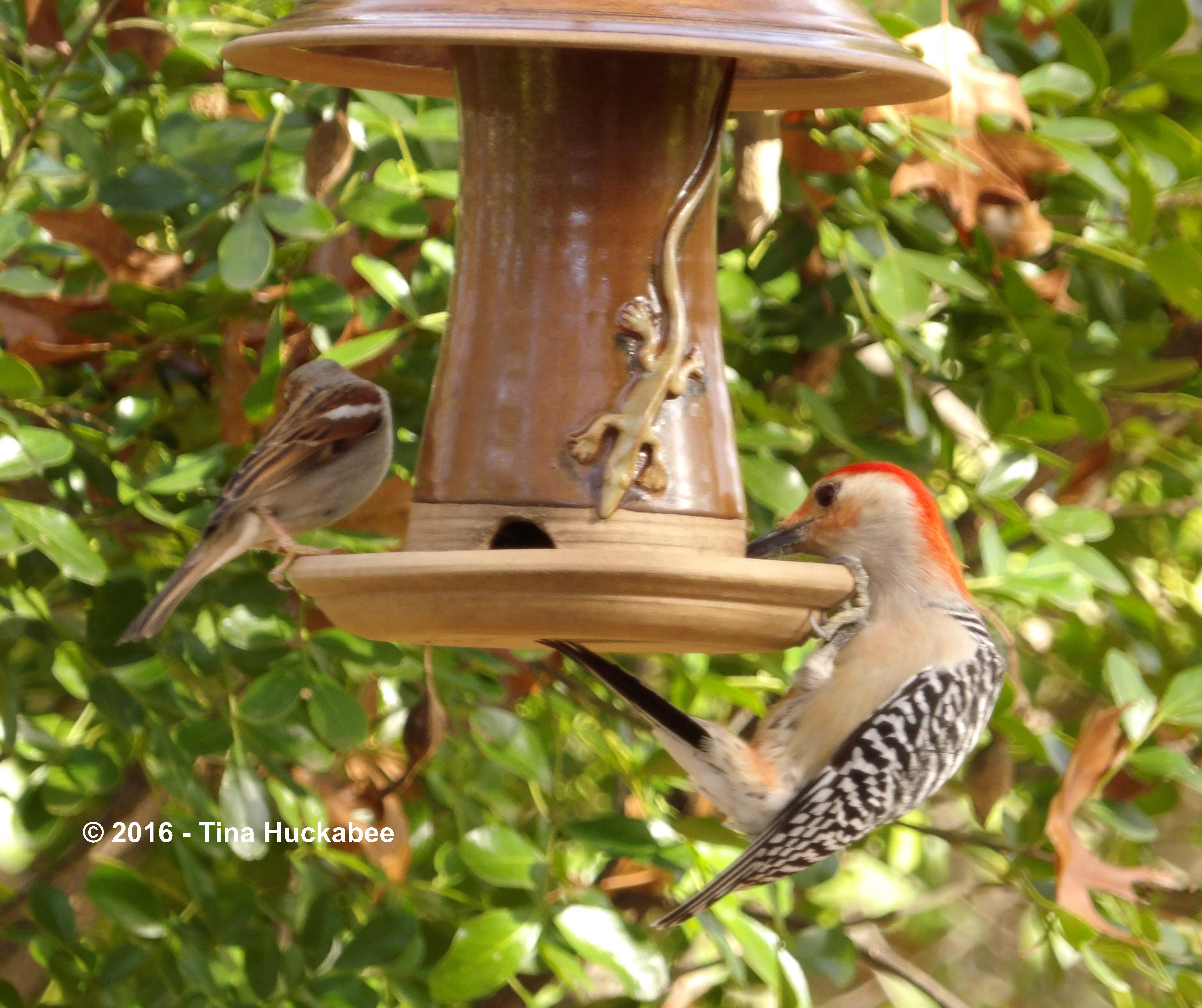 At this feeder though, the Red-bellied Woodpecker doesn’t mind sharing the food bar with a House Sparrow, Passer domesticus.