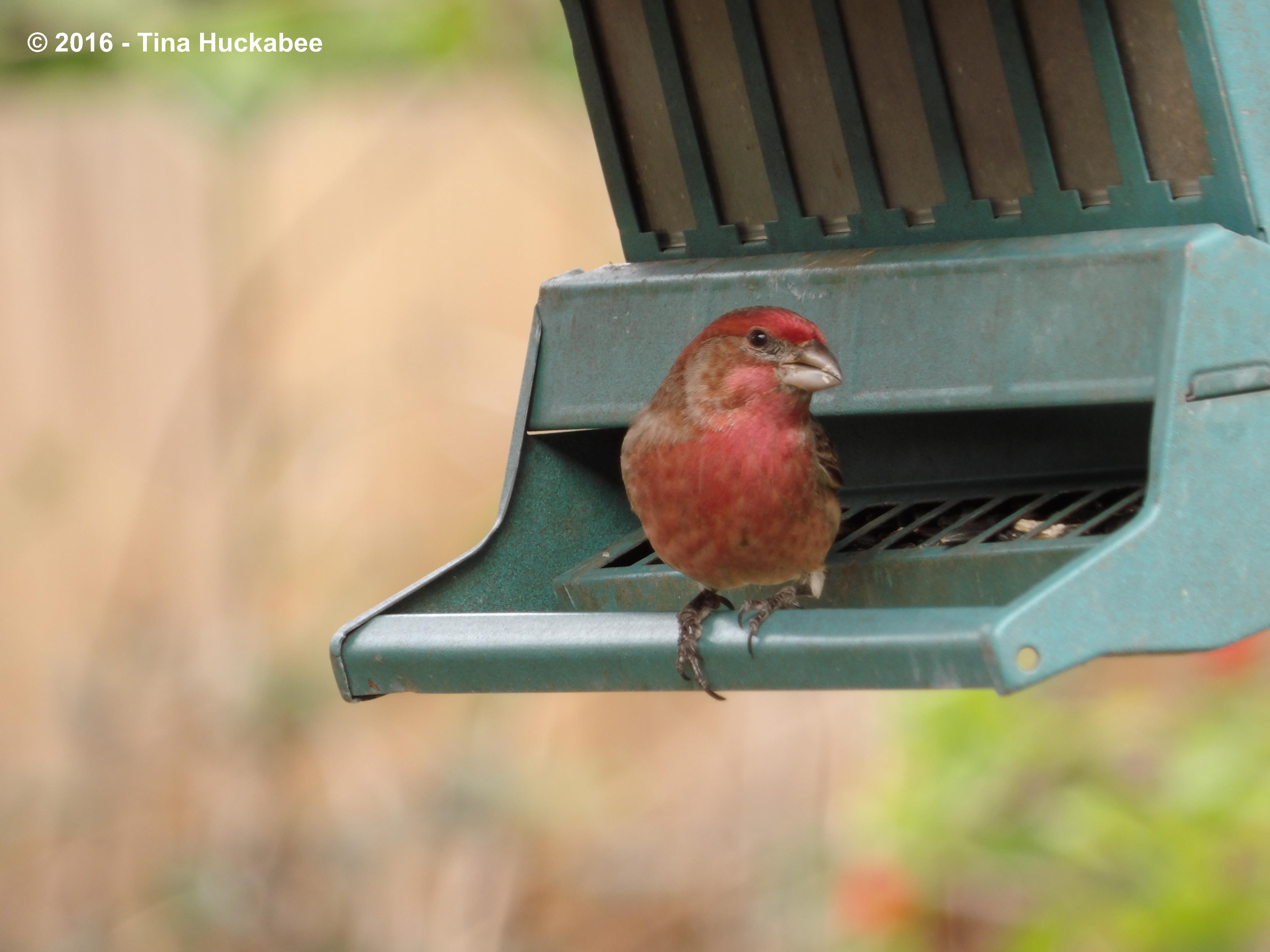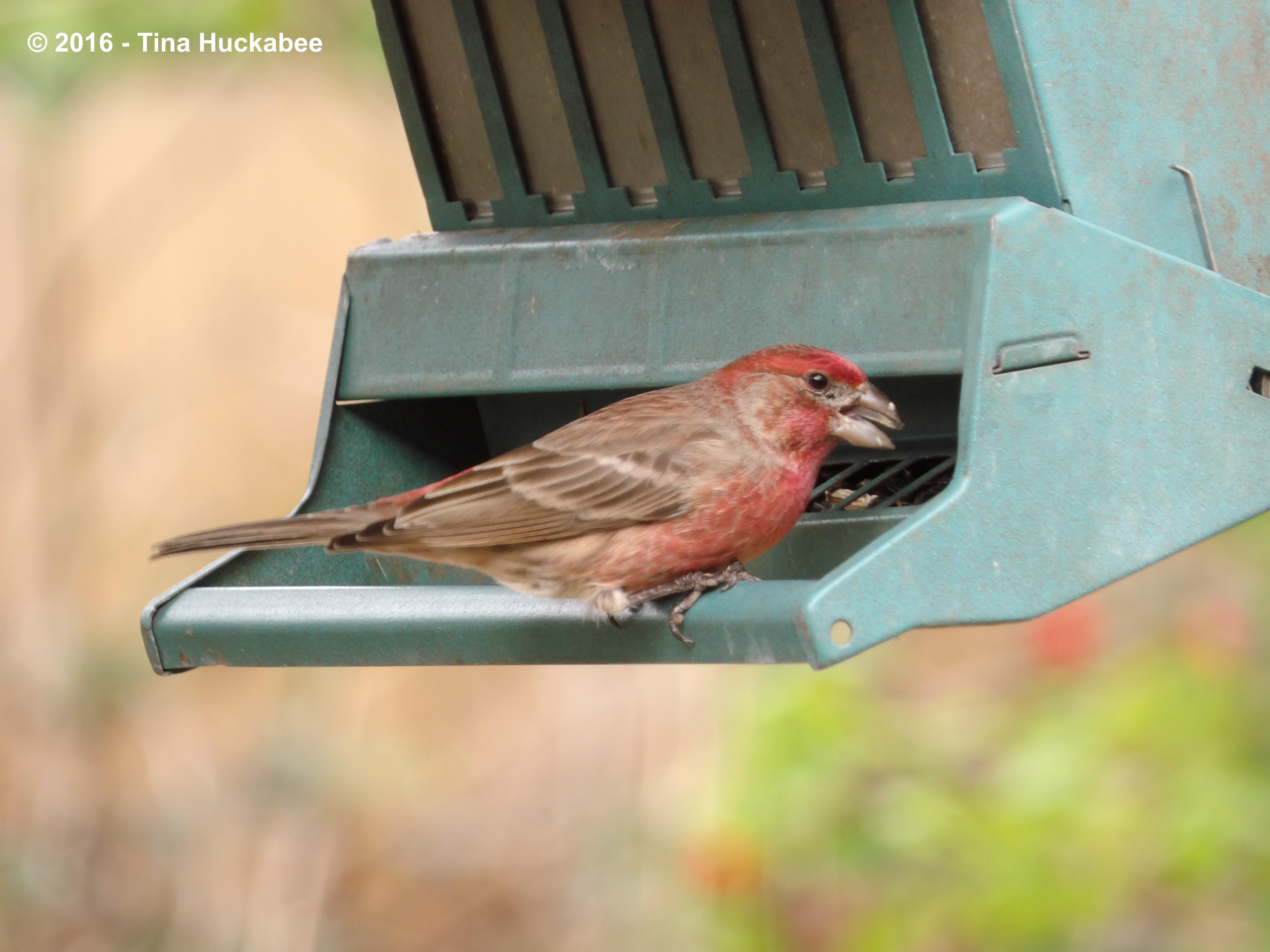 House Finches, Haemorhous mexicanus, sit in the trees, on the ground, and at the feeders. I love these chatty birds and I especially appreciate that they sit still, munching away contentedly for long enough to get good captures. Usually, couples feed together, but at this particular moment, these two took turns–first him,