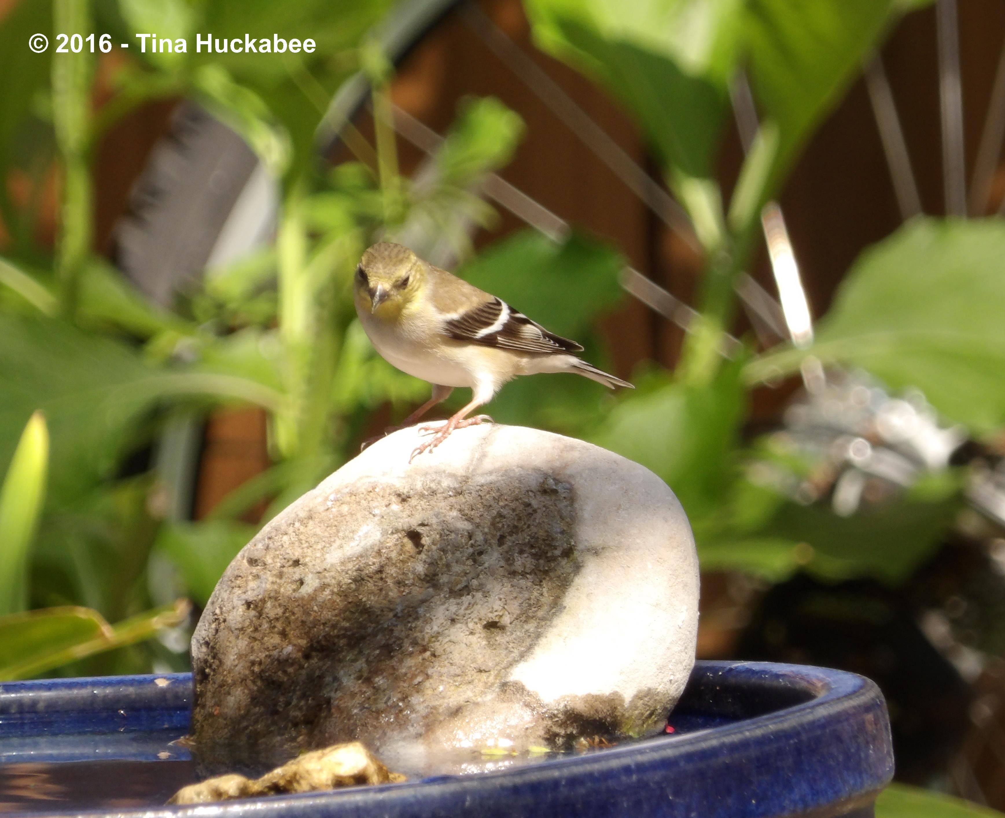 The Goldfinch on the far right, beside the rock, is attempting to take a sip, though not quite sure if he can maintain his balance. Whoopsie! Good thing those wings provide some leverage. Like the Cedar Waxwings, American Goldfinch breed much further north than Texas (into Canada). I haven’t seen the Goldfinch gang in about a week–I assume “my” group is on their way. I’ll miss them.