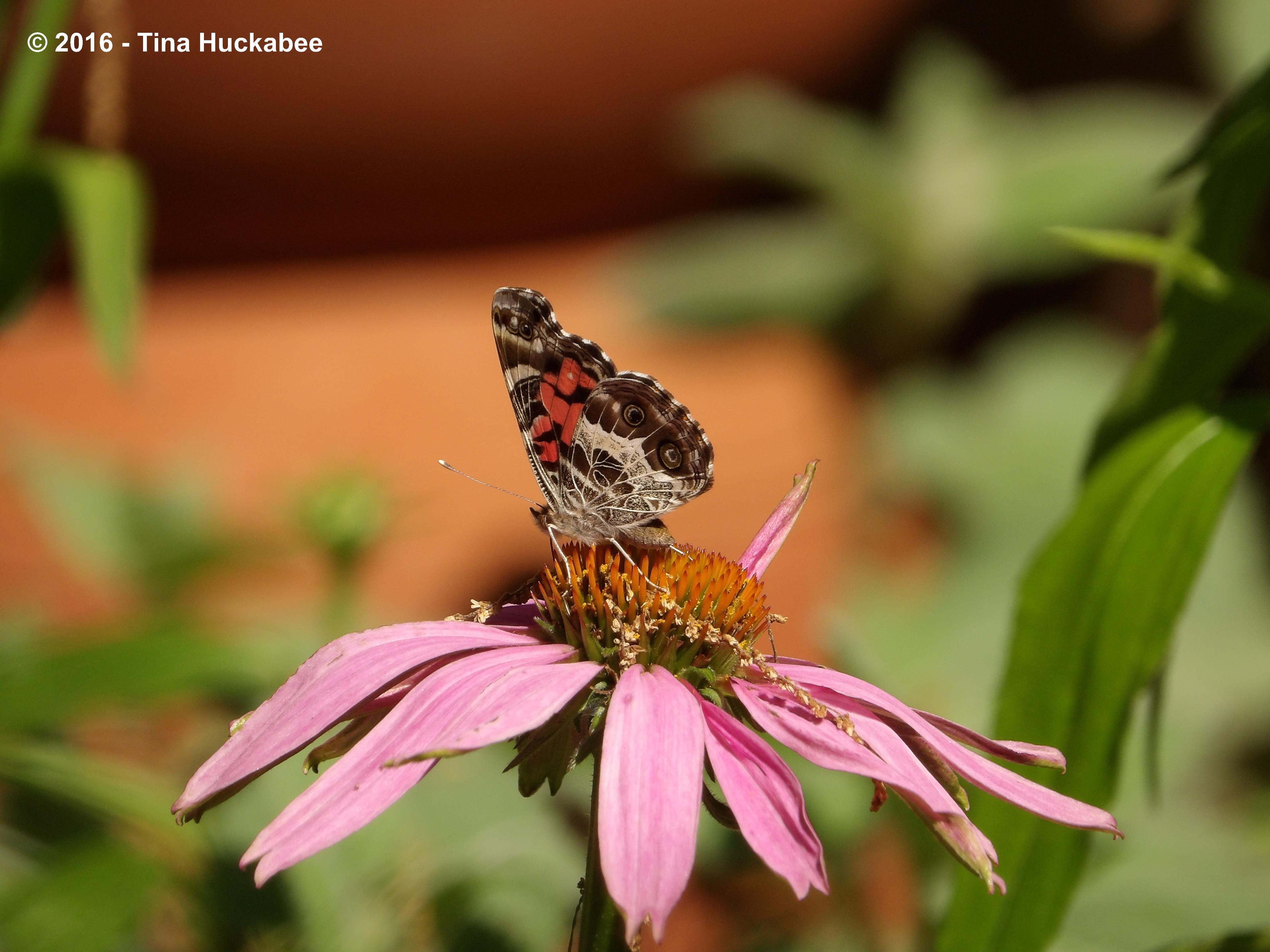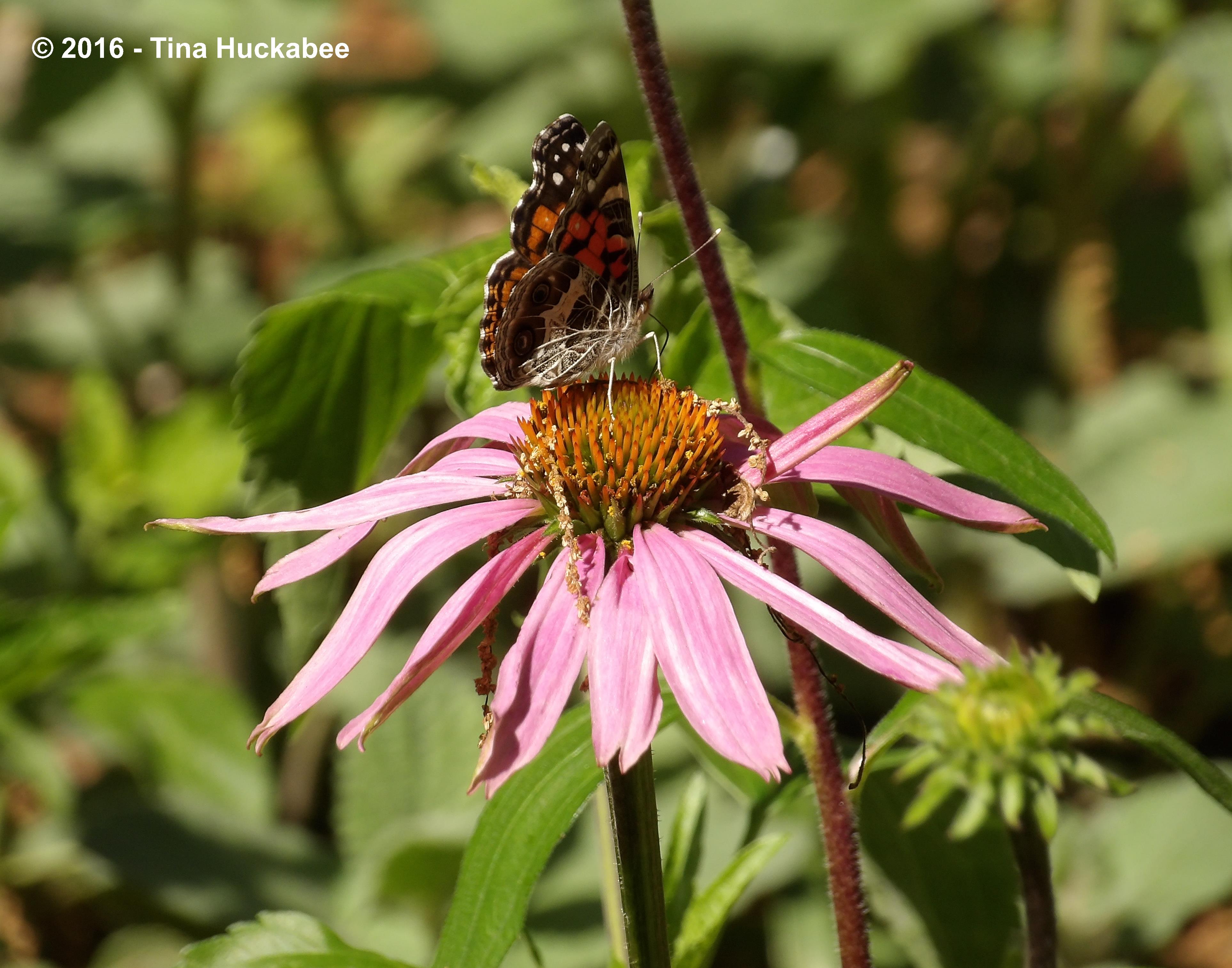 Quite a few butterflies have flitted through the garden, but I never have my camera ready when they land–which they don’t do all that often. This American Lady, Vanessa virginiensis enjoyed the bounty of several individual Purple Coneflower, Echinacea purpurea. Plants in the aster family are listed as both larval and nectar sources for this species.