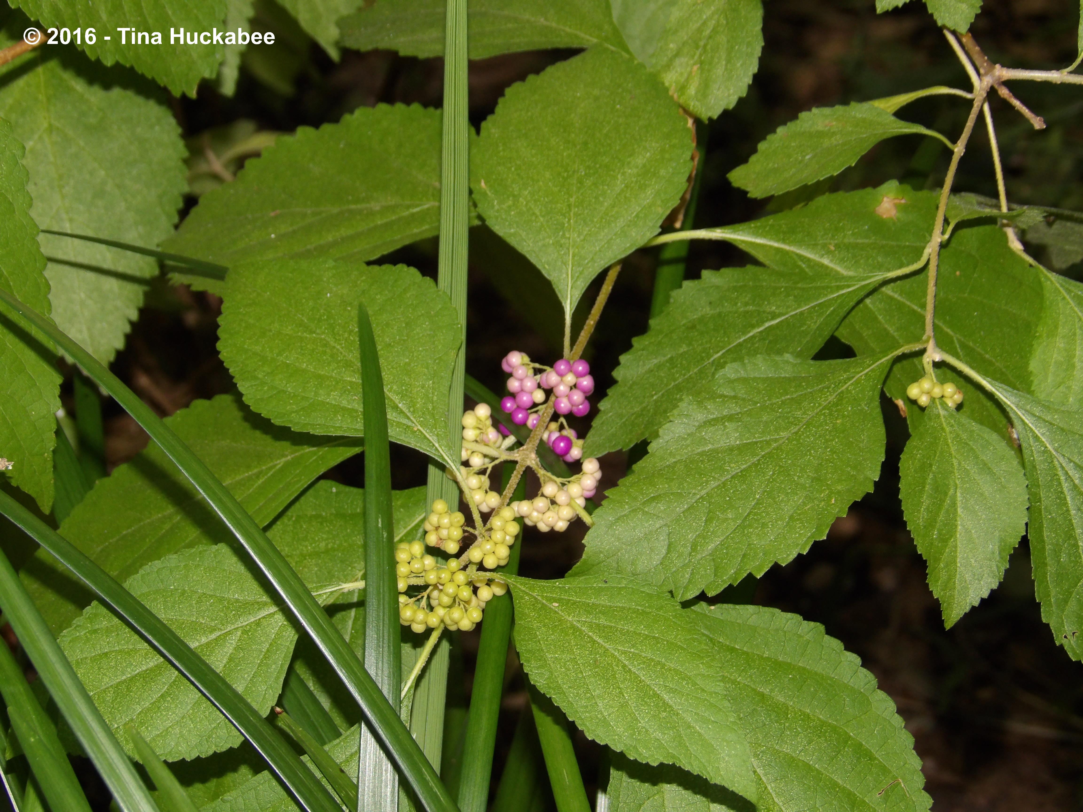 The American beautyberry, Callicarpa americana, is slipping from summer’s green, unripe berries to the autumn–and edible–metallic purple yummies.