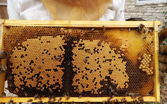 Once we opened Buzz and Woody, our first order of business was to scrape away the rogue comb with larvae and to disposed of it. I hated to do that, but we can’t allow the bees continue building there because it would make subsequent checks impossible. So scrape we did. I don’t have photos of that stuffed-wherever-they-had-room-to-build-it comb, but after we cleaned it up, we began pulling out frames to check for brood and also, to check for queen cells: remember that, it will be important later. In both hives there was beautiful egg laying pattern in many of the combs, with both capped and uncapped brood. The flatter capped brood are those that will become valuable female workers.