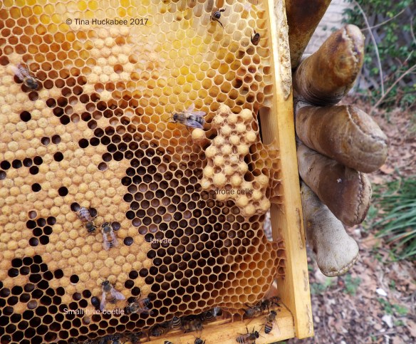 There was also capped brood of drones, or male bees. The drone eggs are usually laid at the sides and bottoms of the frames and, once capped, are larger and rounded.