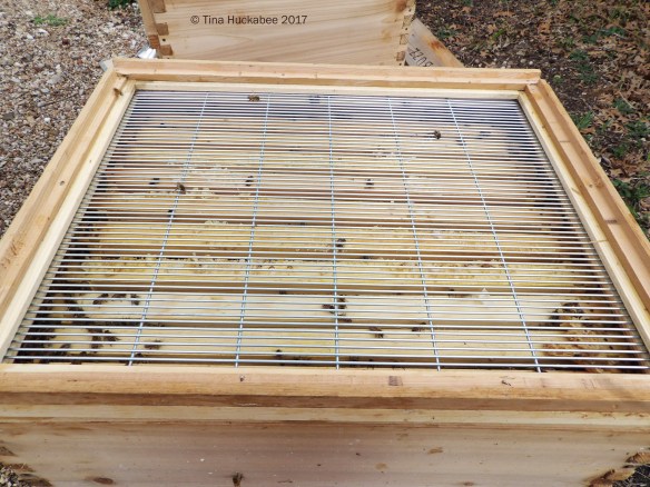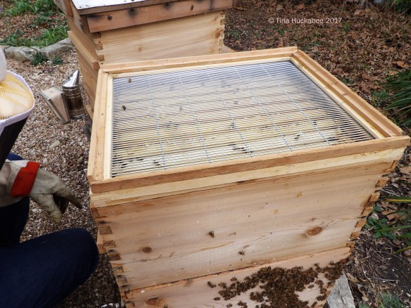 Buzz and Woody were so full that we added another brood box to each; both now have two brood boxes, with room to grow. To Buzz we also added a shallower top box called a dadant box; it will be only for comb and honey. How do we keep the queen from moving into this top box and laying eggs? We added a queen exlcuder (a metal frame laid horizontally atop the second brood, now middle, box), between that brood box and the new dadant box. Only the worker bees can enter the dadant–the slats are too narrow for the larger queen to get through.