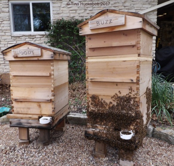 Oops! We realized we’d better hop to it and to check things out before Buzz and/or Woody initiated a swarm. A honeybee hive is a superorganism consisting of many individuals, but who function as a whole organism. Individual honeybees don’t mate and reproduce, they have a queen who mates and lays eggs and that’s her only function. The workers are all of the other honeybees who keep the organism, the “hive,” clean, fed, and productive. If a hive becomes crowded to the point where the queen has difficulty finding places to lay eggs, the bees will produce another queen. The original queen will leave the hive to form a new one, taking roughly half of the workers with her. Two queens, two hives–that’s honeybee reproduction.