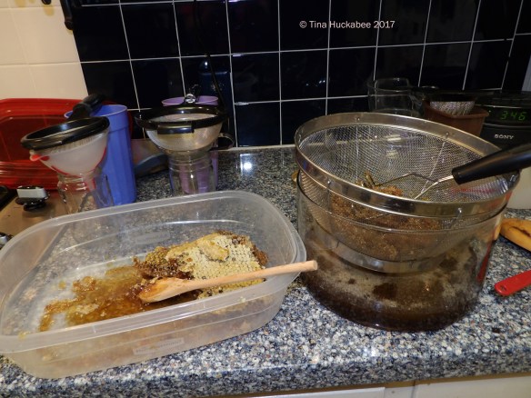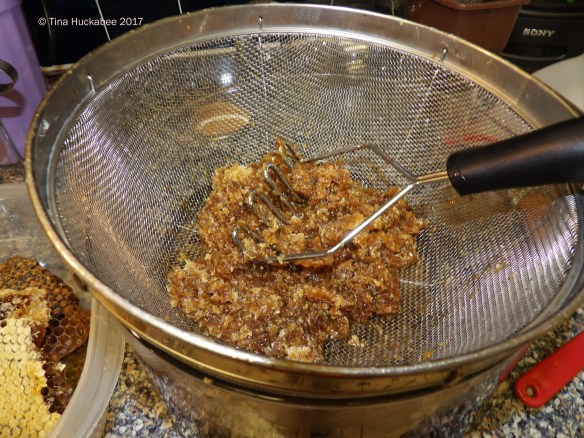 That same weekend, I finally processed the honey that I’d removed from Scar, our original hive, which I wrote about at the end of my last Bee Mama post. I crunched the comb and dripped as much honey as feasible into four, 12 ounce jars.