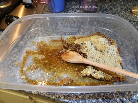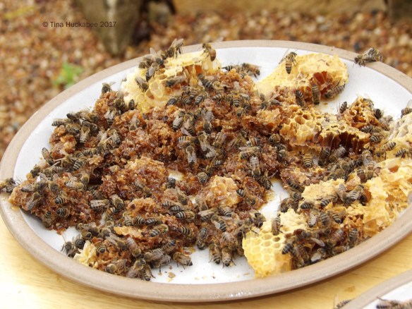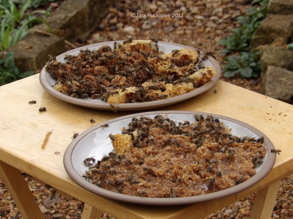 As has been my practice, I laid out the rest of the pulverized comb with plenty of honey still available for the bees to enjoy.