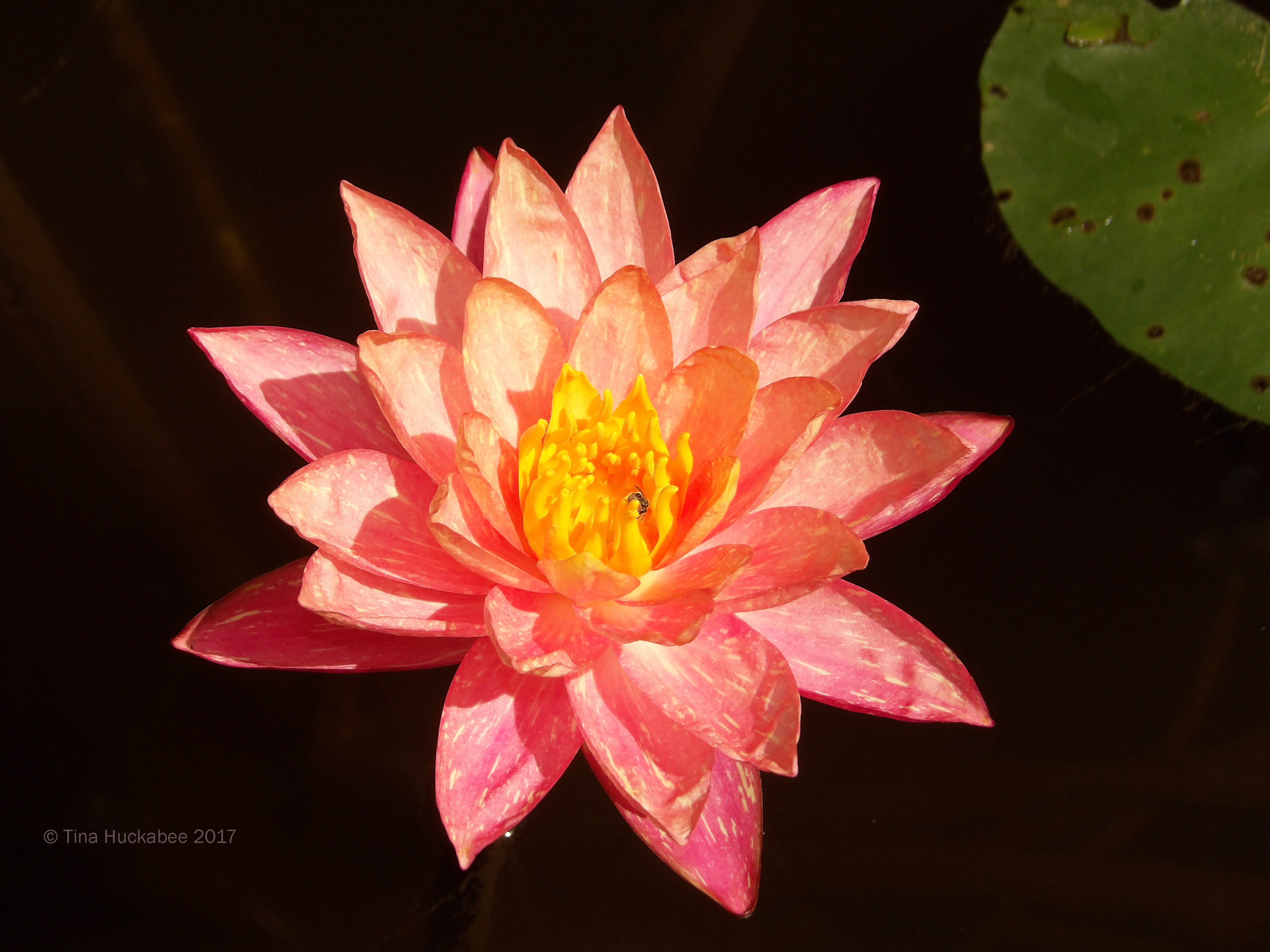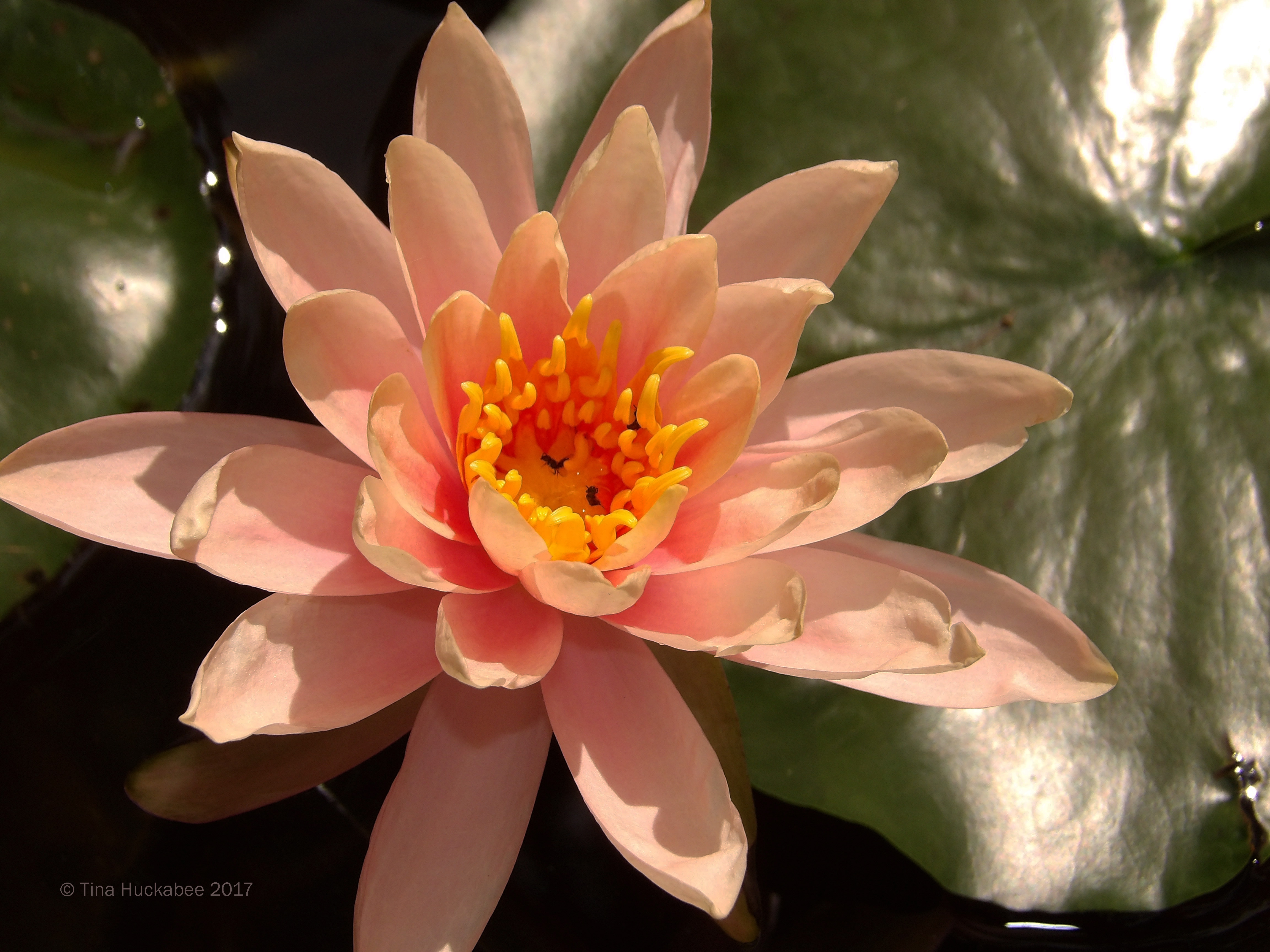 Wanvisa waterlily has vibrant pinky/orange petals with cream-to-yellow streaks; it  is a dramatic and richly colored lily. Though it didn’t happen with this first bloom, apparently Wanvisa will sometimes open with a section of petals rocking a Bride-of-Frankenstein streak of cream or yellow with the rest of the flower as you see it here.