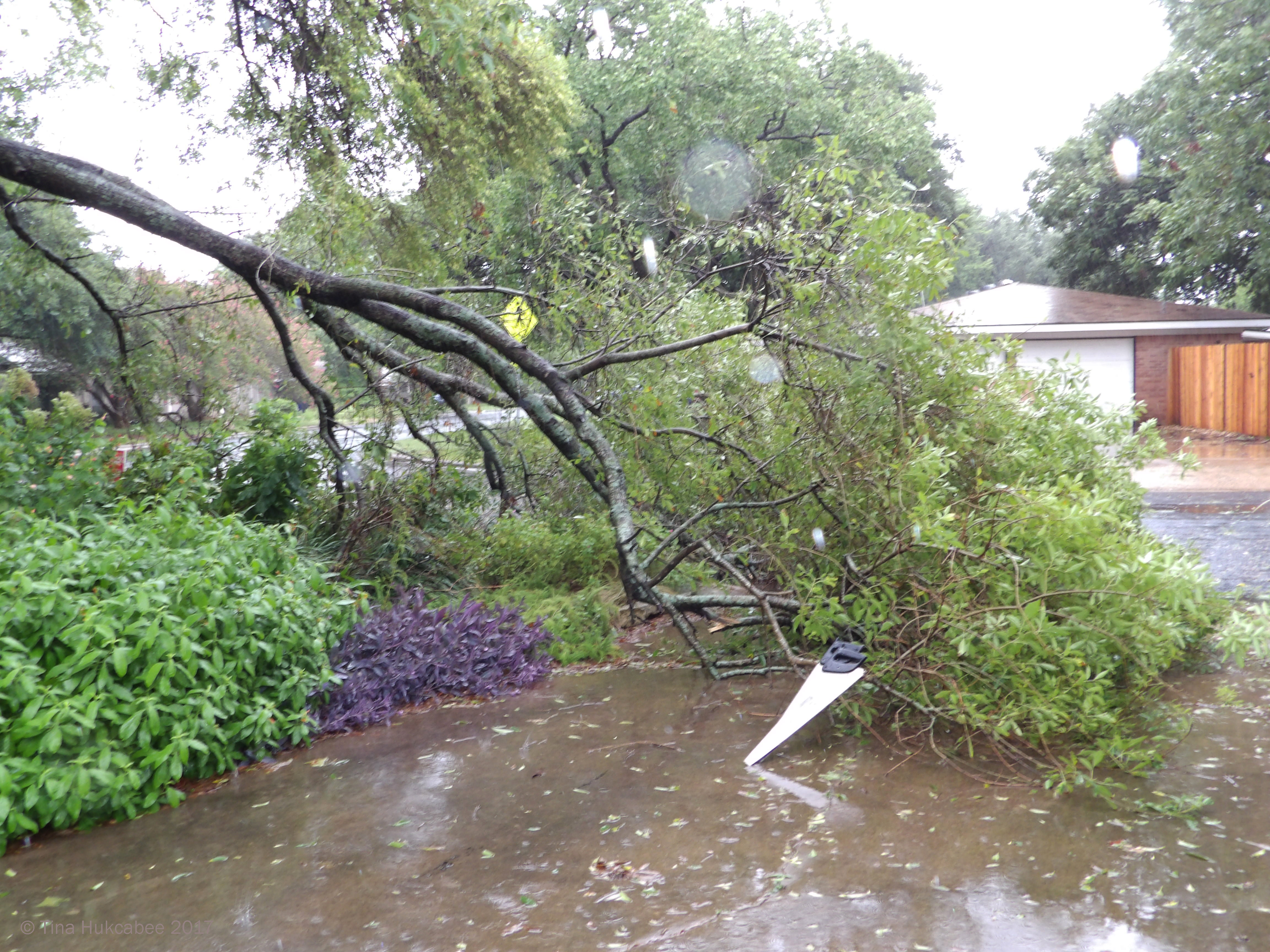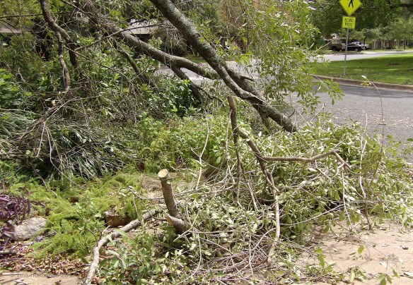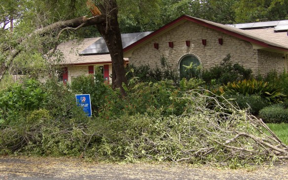 A week after we pruned, some lovely guys from the city of Austin’s waste crew came by and removed most of the tree detritus. Eventually, the arborist crew arrived, took out the rest of the large branches, and all was cleaned up.