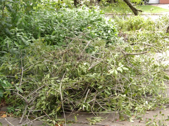 I called my arborist that morning, but he wasn’t able to take this job. I made several other calls, securing a promise from a neighbor’s arborist–I was 7th on his list. Because it was unclear how long it would be before the arborist could work some pruning magic on the tree (it ended up being 10 days), we gathered various saws and pruning utensils and got to work on the smaller branches in the street and along the driveway to tidy the tangle of tree.