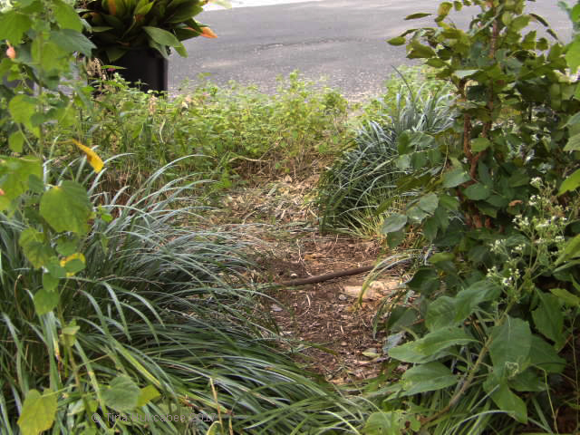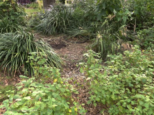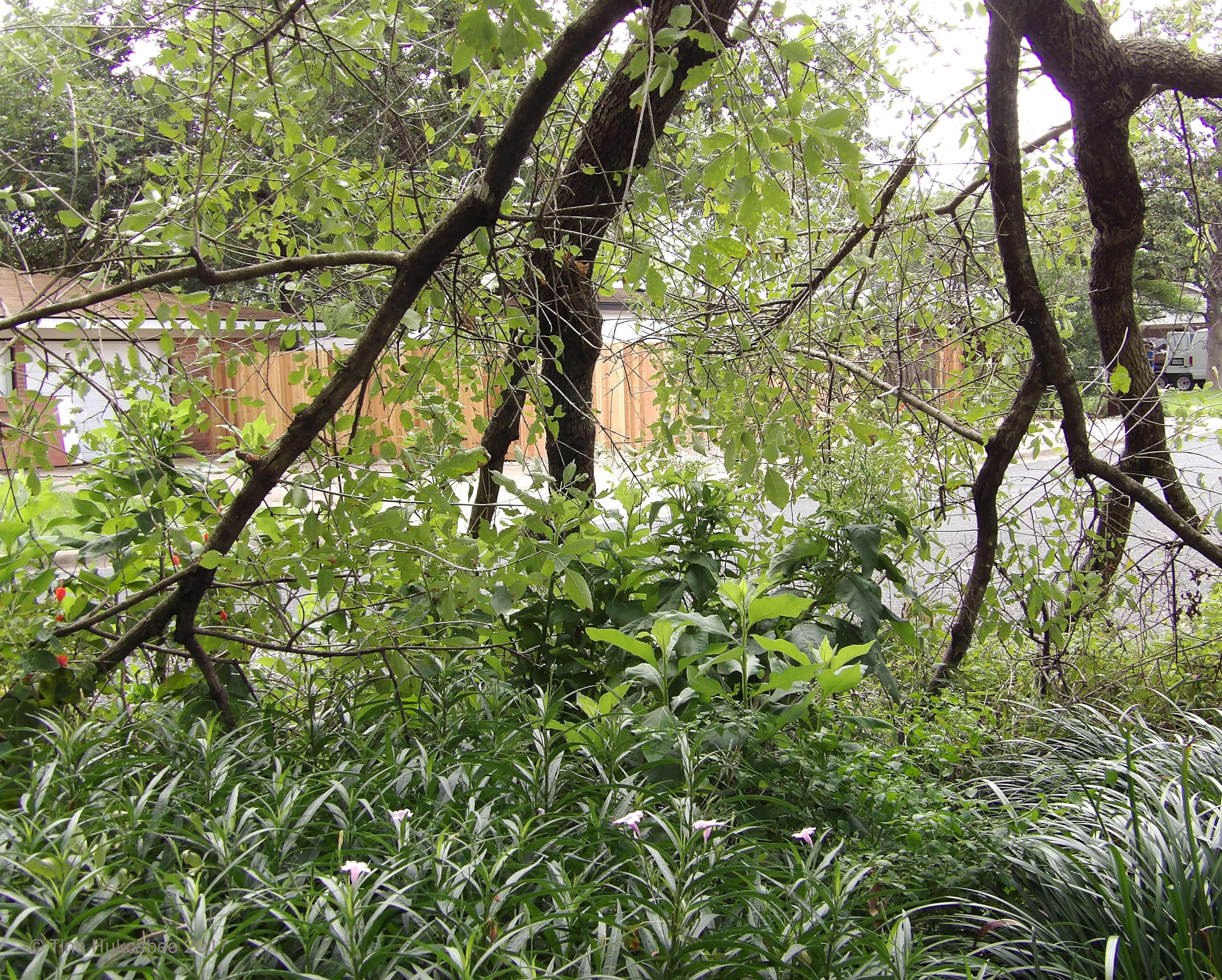 In this shot, some liriope has been removed, leaving a space for…? Prior to the tree-fall, only the outer edge of this garden (at the street) received direct sun; after the tree-fall, all of this is in full sun.