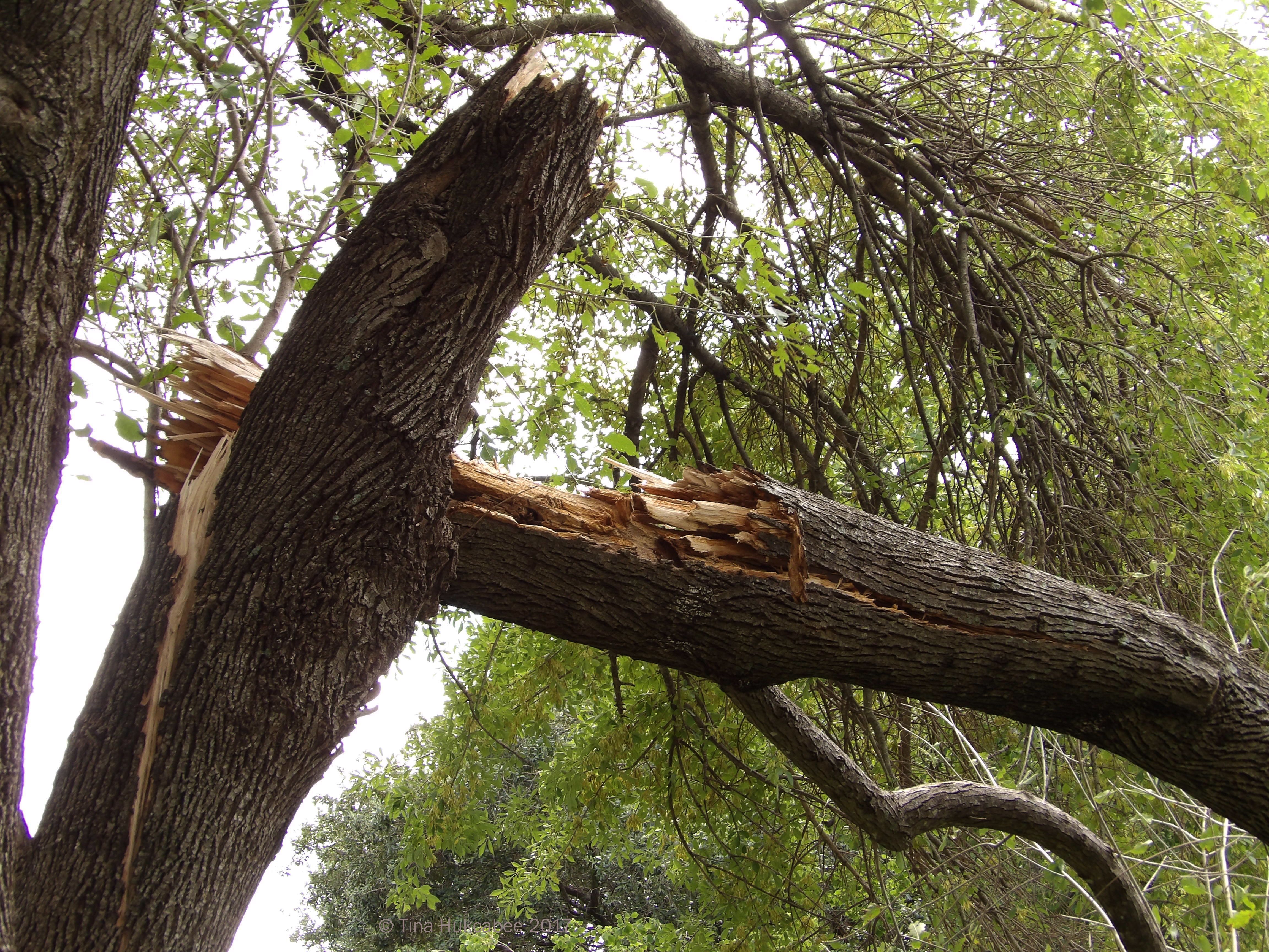This mature Arizona Ash split at one of its two main trunks, not at the crotch (which might be expected), instead, a bit higher up.