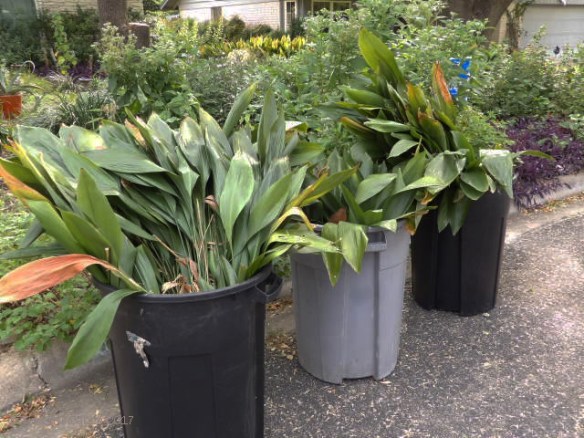 Three of many bins of plants from this project. The plants won’t go to the landfill, but will end up as part of a sewage-sludge product called “DilloDirt,” an excellent garden amendment.