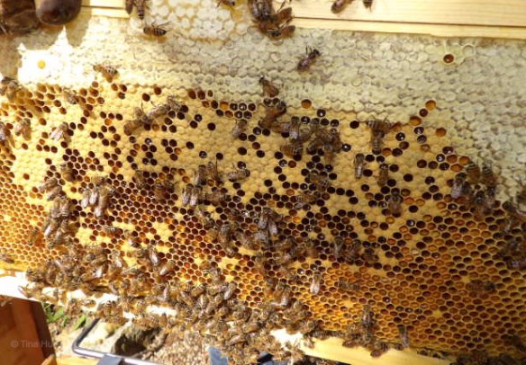 The top part of the frame is capped honey, below are the cells where larvae are nurtured and bees are hard at work for the hive.