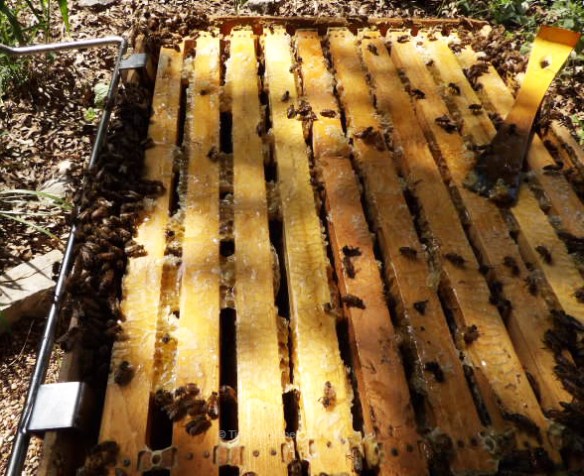 I was doing great until I got to this sentence: “The bees built the wonky comb in the super because we, their keepers, placed top bars, rather than full frames with wax foundation, in the supers.” I guess I don’t quite grasp the concepts of ‘top bars’ and ‘ full frames with wax foundation.’ It looked to me as though the frames in the first couple of photos would qualify as ‘full frames’ — but that could be a technical term I’m misinterpreting. I’ll go do a little search.