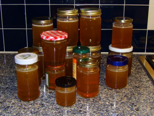 I’m practicing hoarding, just like our bees: honeybees naturally hoard honey, just in case, and I’ve set aside a number of jars to keep, if there’s some glitch with the hives and we go a year without getting honey.