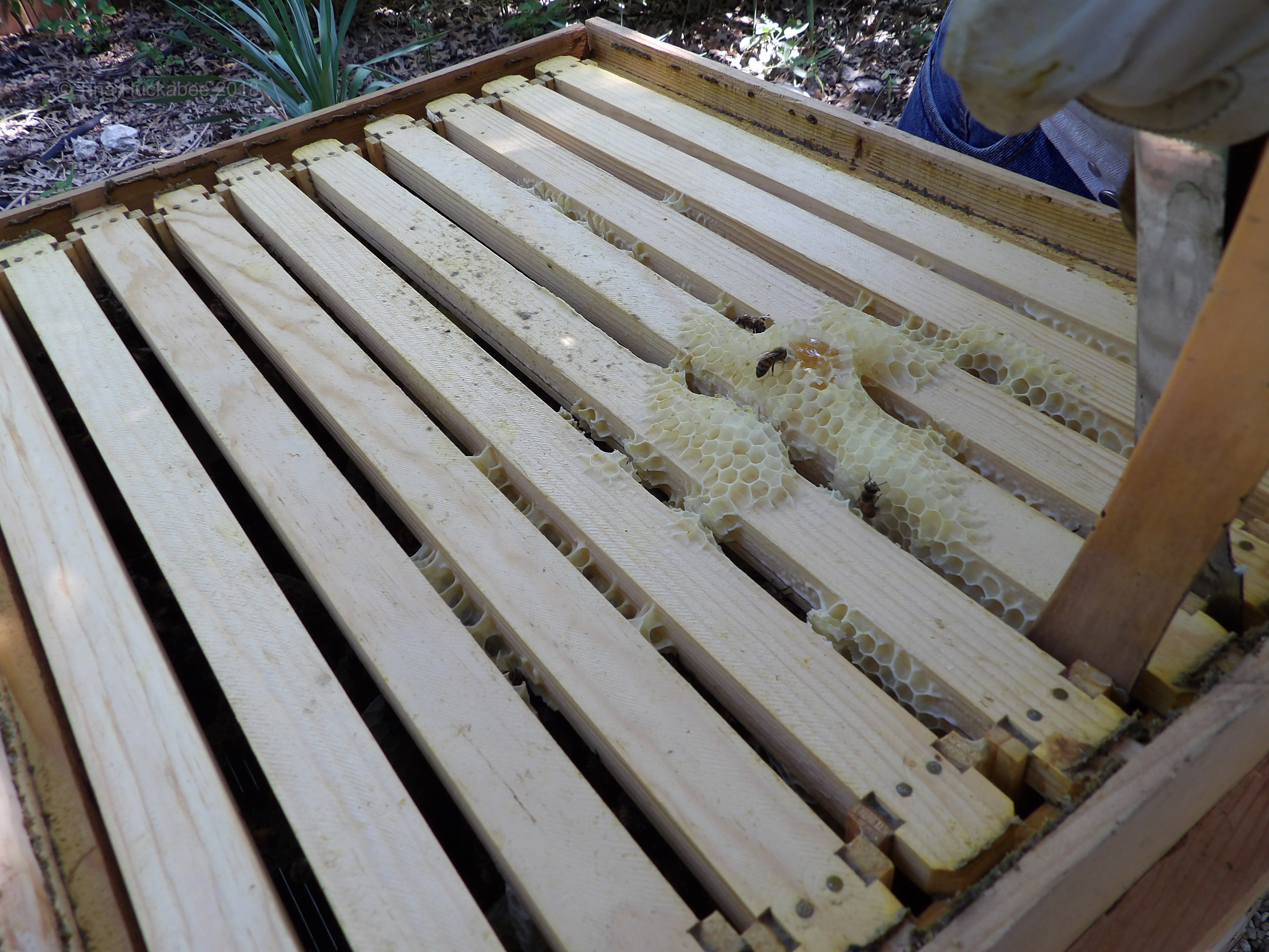 I was doing great until I got to this sentence: “The bees built the wonky comb in the super because we, their keepers, placed top bars, rather than full frames with wax foundation, in the supers.” I guess I don’t quite grasp the concepts of ‘top bars’ and ‘ full frames with wax foundation.’ It looked to me as though the frames in the first couple of photos would qualify as ‘full frames’ — but that could be a technical term I’m misinterpreting. I’ll go do a little search.