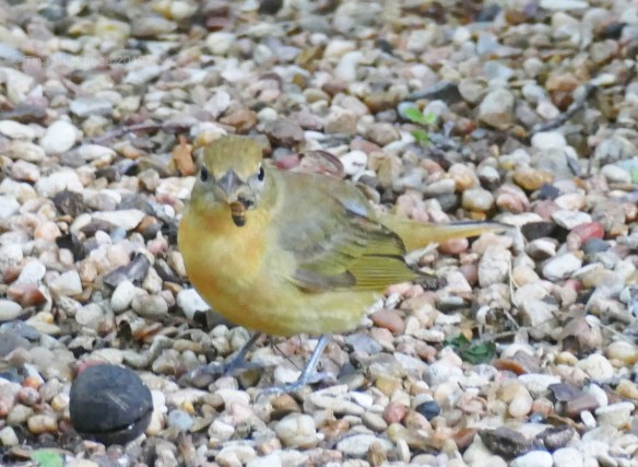 Anoles are garden predators and will eat anything smaller than themselves–except for honeybees, I guess. Maybe the green goblin can learn something about honeybee consumption from this female Summer Tanager, Piranga rubra.