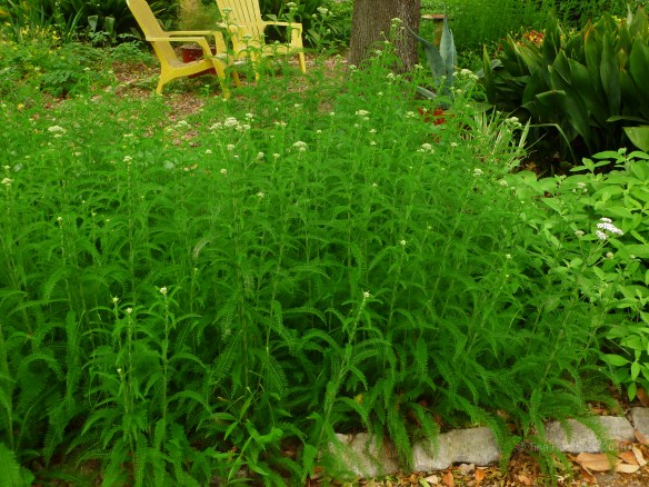 While Yarrow flowers produce seeds (those finches are eating something!), the only spread I’ve observed is with the roots of established plants. In this shot, the foliage has crept out of the border of the garden and into a walkway. I’m tolerant of this creeping action–to a point. When I’ve had enough of Yarrow’s teen-like testing of boundaries, I simply dig out the offenders and toss them into the compost bin or give to another gardener. With healthy attached roots and a smidge of extra watering, Yarrow transplants easily.