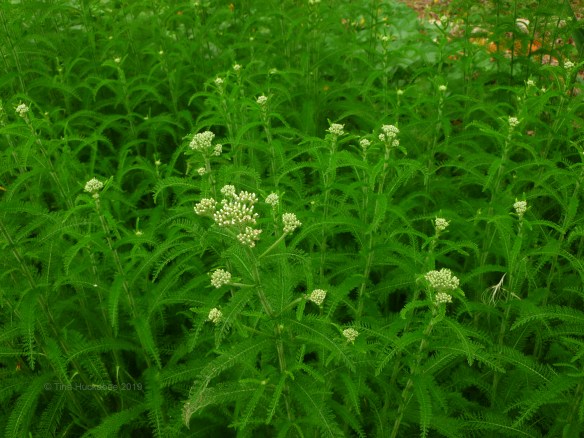Into July, a toasty quality appears on Yarrow as the pure white flowers go to seed. As summer settles in with its heat and glaring sun, the flowers decline, seeds develops and Yarrow’s pure white tops turn tan and toasty.