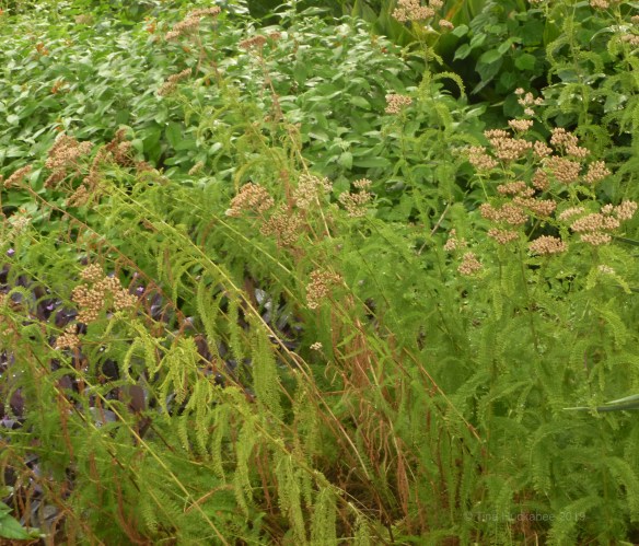 Yarrow is a great plant, though beginning to look a bit peaky now. I like seed heads too and leave them on spent blooms as long as I can. The downside is that, well, seeds drop and then germinate. What to do with all those seedlings??