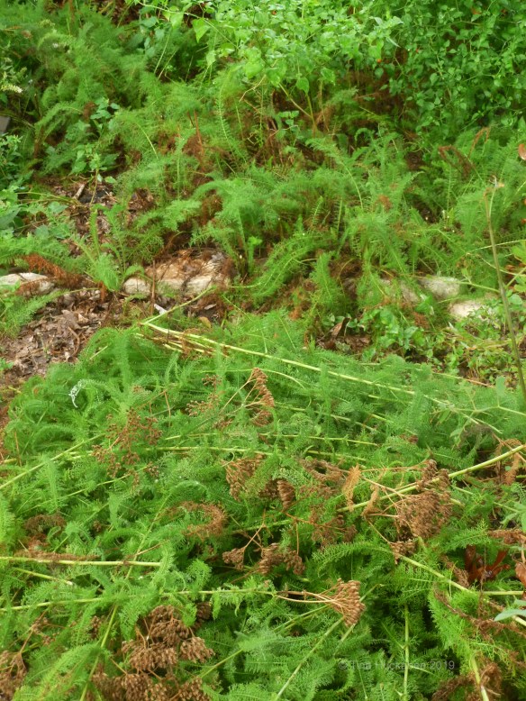 Yarrow’s flower-to-seed heads beauty doesn’t last forever, though. Typically, by the time the flowers are long done and the seed heads are crumbling, the bloom stalks are also bent with age and environmental impacts. After all, they’ve held aloft sweet blooms and nutty seeds for many to enjoy through spring thunder and wind storms and searing summer sun. Bottom line: Yarrow is messy by late summer.