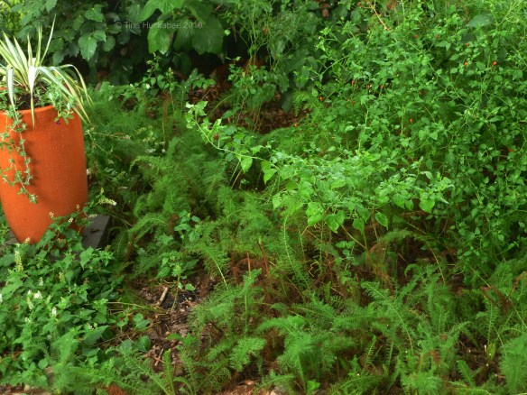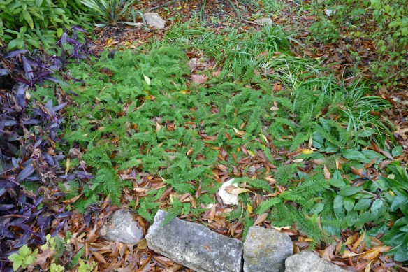 Yarrow in its ground cover mode planted with Chili pequin (top right) and a container plant (left).