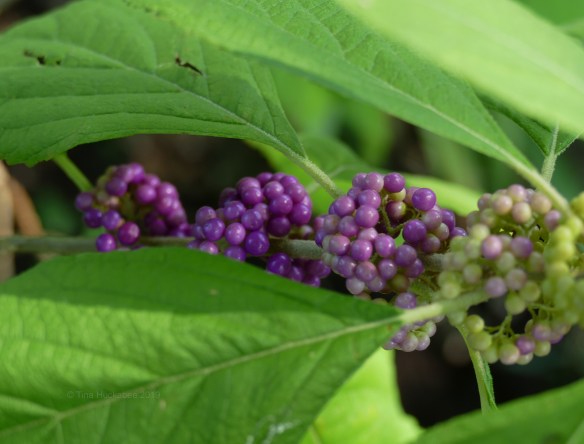 The diminutive pink beautyberry blooms of June are long gone and the replacement purple fruits will remain until birds eat or cold withers–which ever happens first.