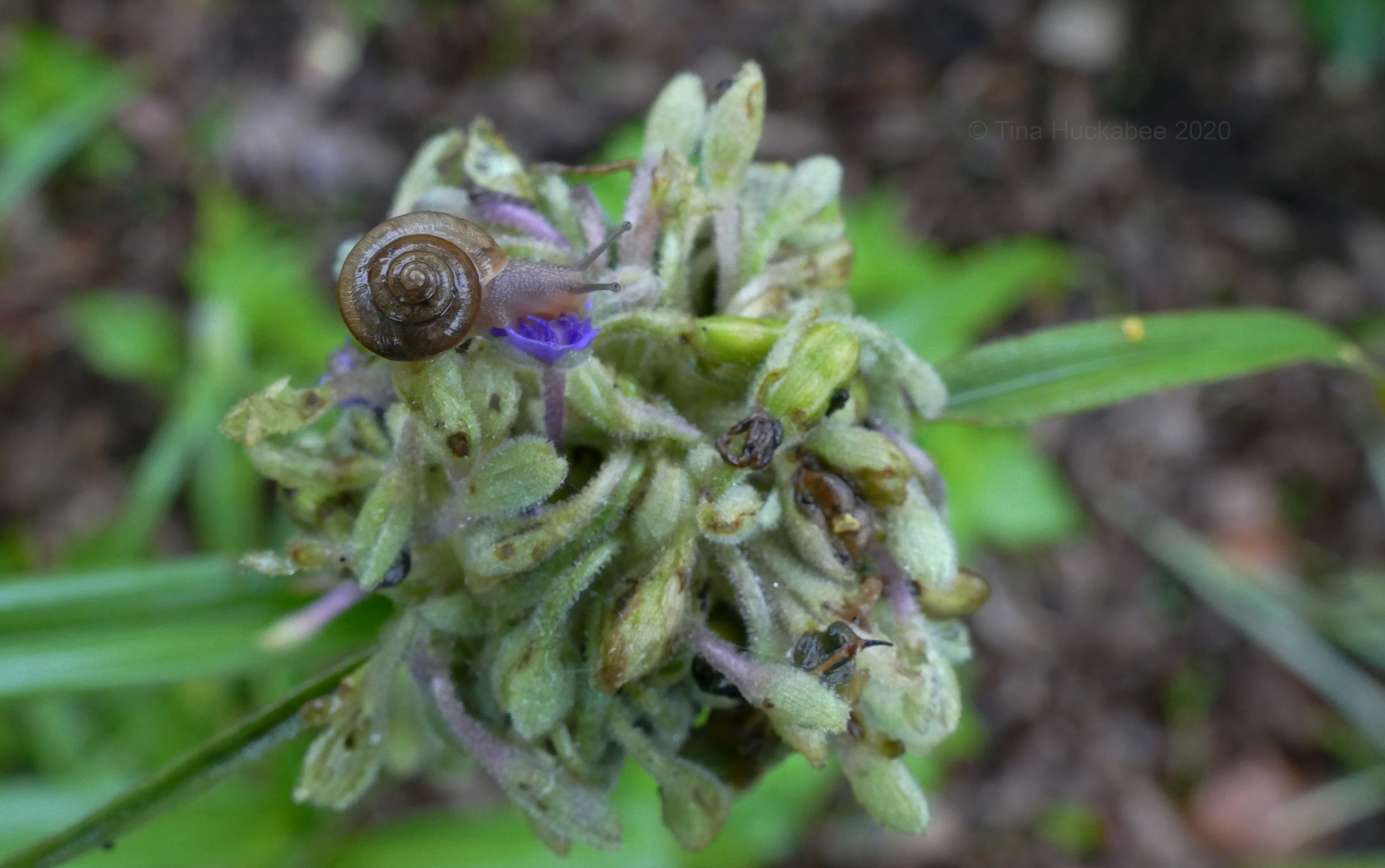 I’m always happy to come across a snail that has climbed high up on a plant, as that’s one more chance for a picture without much distracting background. I don’t have to contemplate the damage to plants that you do as a gardener.
