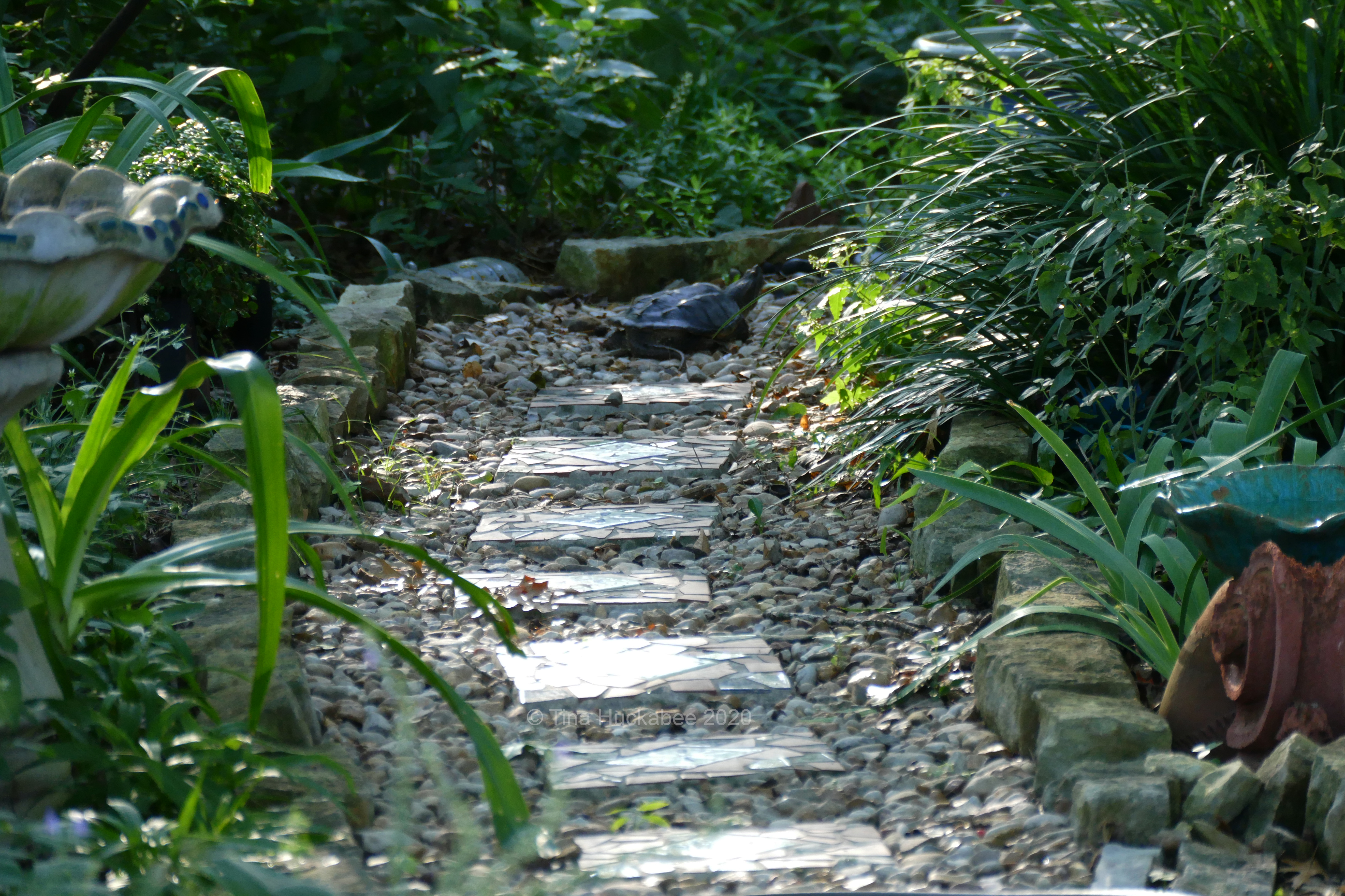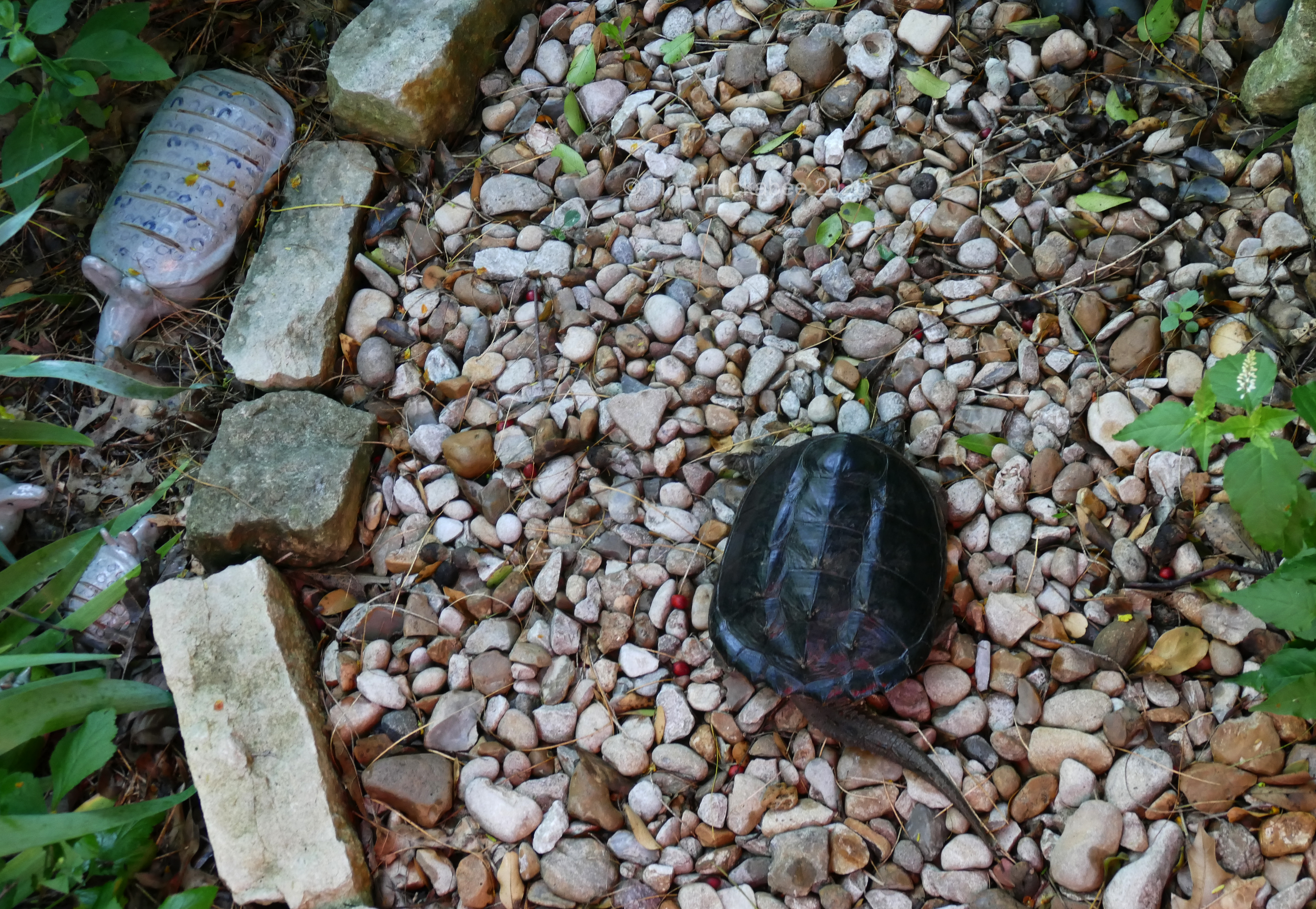 I like this shot: live snapping turtle headed one way on the path, ceramic armadillo (with accompanying ceramic babies) headed in the opposite direction.