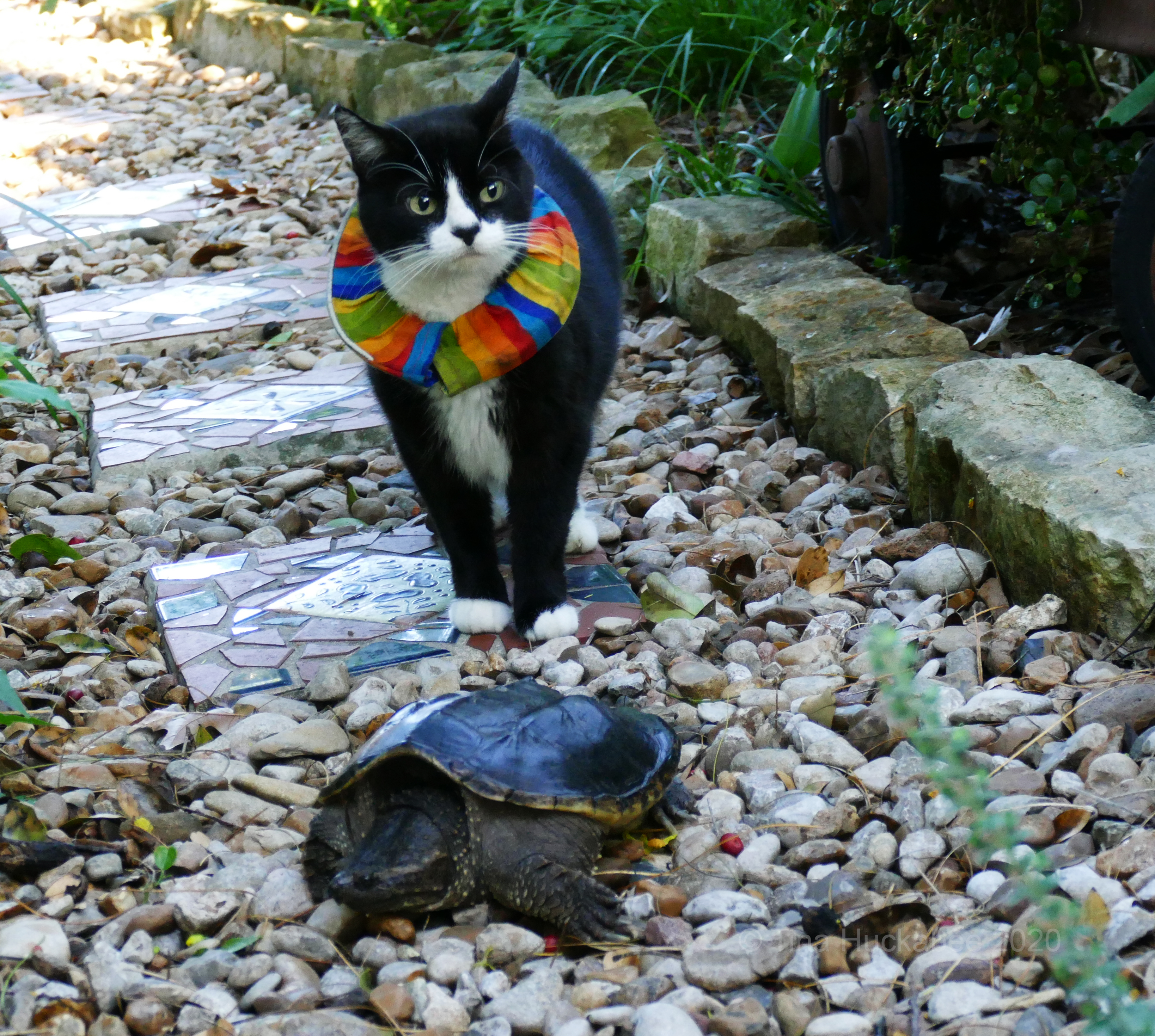 What a pleasure to enjoy in your garden a Texas spiny lizard and two rat snakes: I love it. I love the common snapping turtle even if it doesn’t behave very well with the pond, and the photos are magnificent. Astrud is gorgeous and charming with her rainbow necklace. She is the same as my cat Pepé who passed away in 2015. Astrid is very good, she continued taking her walk without disturbing the turtle. The cut lily pad next to the lily with water full of tadpoles swimming: the next generation of toads, a catastrophe. The common snapping turtle ate the lilies, smashed the water lilies – they are the risks of having a garden for wildlife. Fortunately, lilies are regrowing. But how long will they last? Tina thank you very much for the instructive and fantastic video of the turtles: I have learned a lot. Tina forgives for not writing before but the heat of 33ºC, which is nothing for Madrid since we arrived in Summer at 40ºC, and the storms with rain and the atmosphere rarefied by storms have aggravated my depression and I have had a headache. Keep you and your husband safe. Happy Gardening of Wild Life !! Very affectionate greetings from Margarita