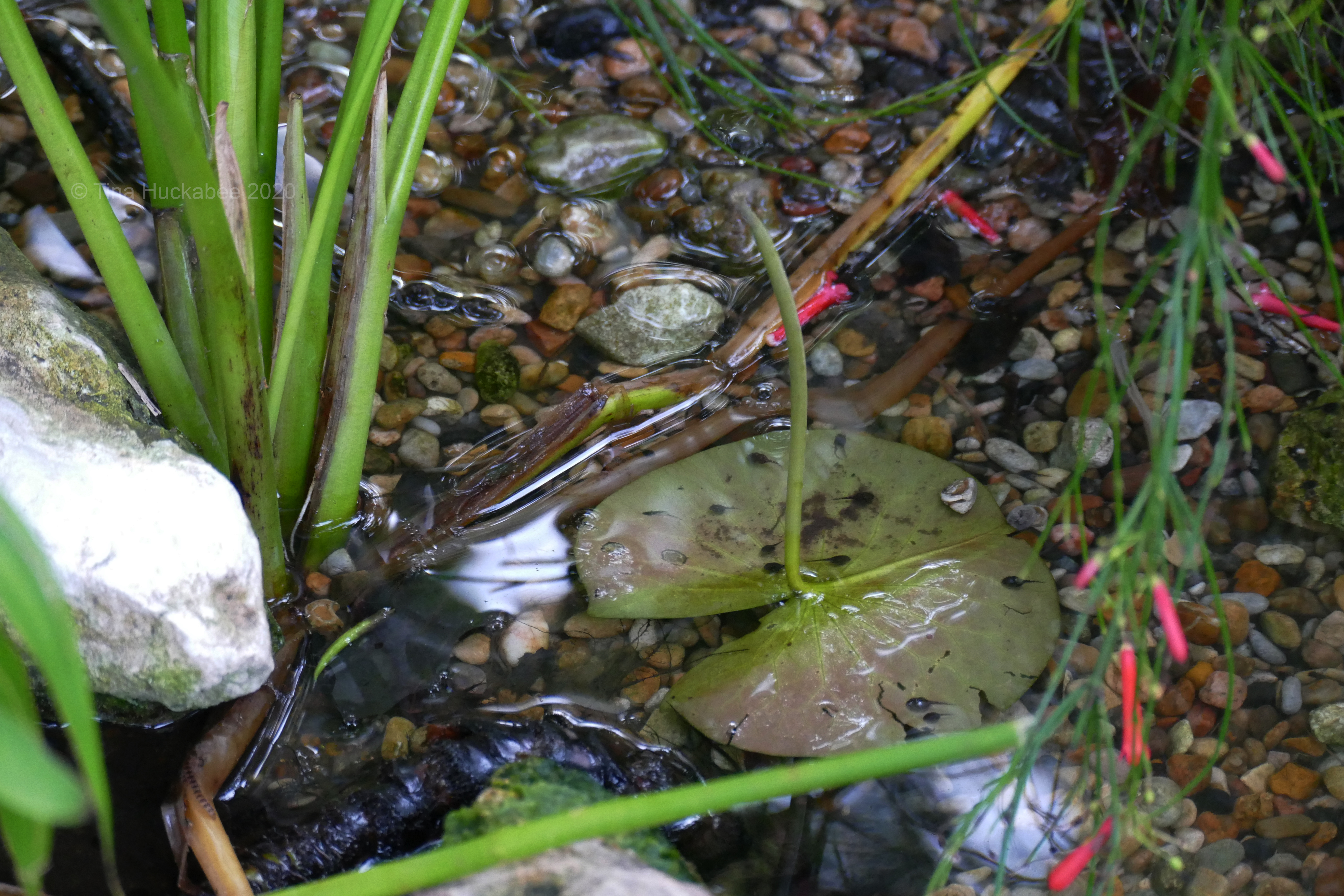 Yes, it was exciting! I haven’t seen it since and suspect it moved on. As for the lilies, grrr! I checked them just a little while ago; I think the fish have finished the greens! The lilies are alive and trying to send up new shoots, but they are getting nibbled to the nub. I’m going to feed the fish more often over the next few weeks and see if that’ll help the lilies recover. They’re pretty tough plants. I hope. 🙂