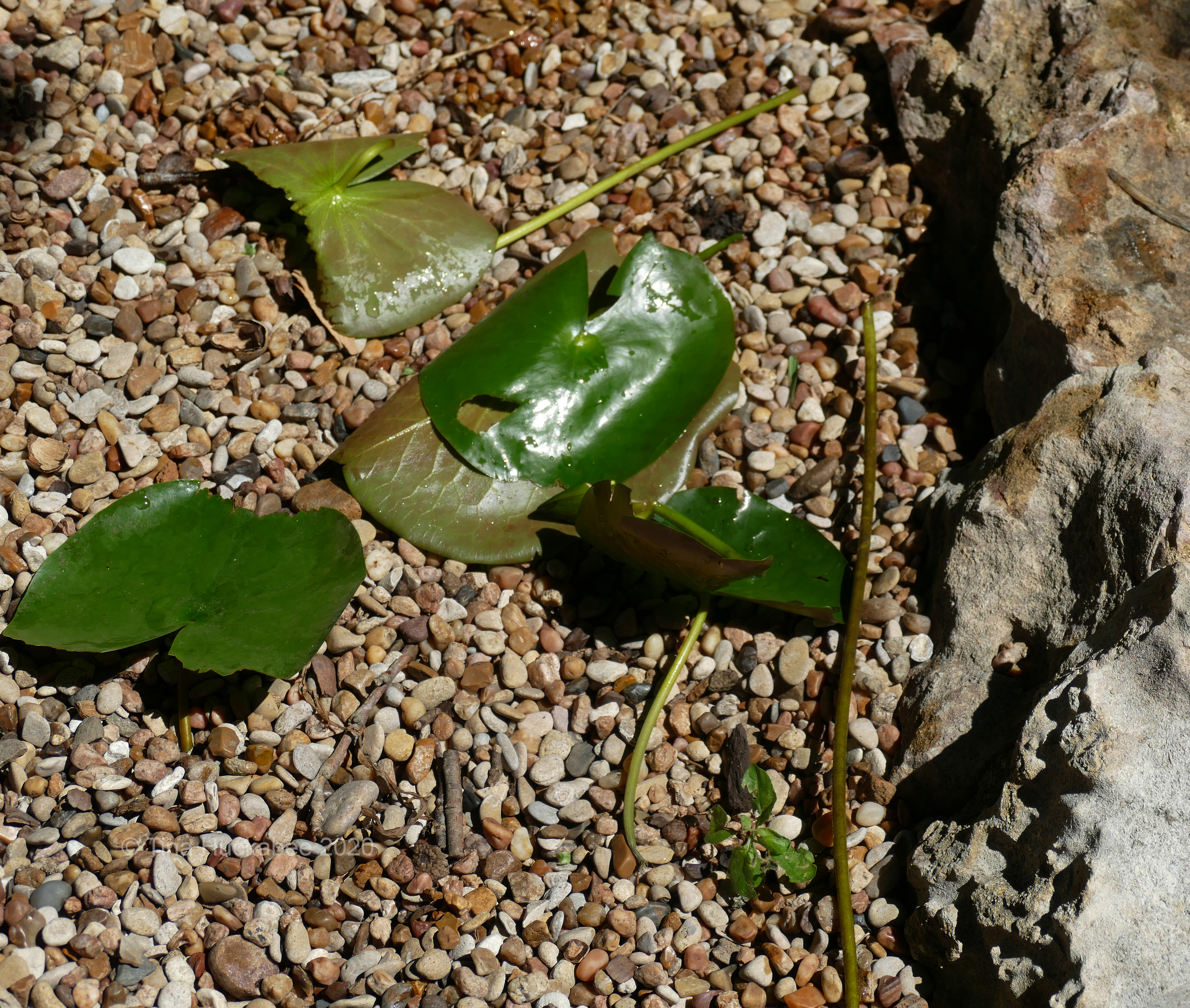 The day of the turtle sighting, I noticed that all the lily pads were arranged in a half-moon shape around the edges of the pond, the pads all bunched up, with no social distancing. Had something disturbed their normal pattern? The water was also murkier than normal. Raccoons have sometime mucked around in the water, though no real damaged has ever resulted, other than terrifying the poor little fish. I didn’t think much about either bit of evidence until the next morning, when I observed that of the lily pads remaining, most were upended. The pads had clearly been chopped off from the base of the plants.