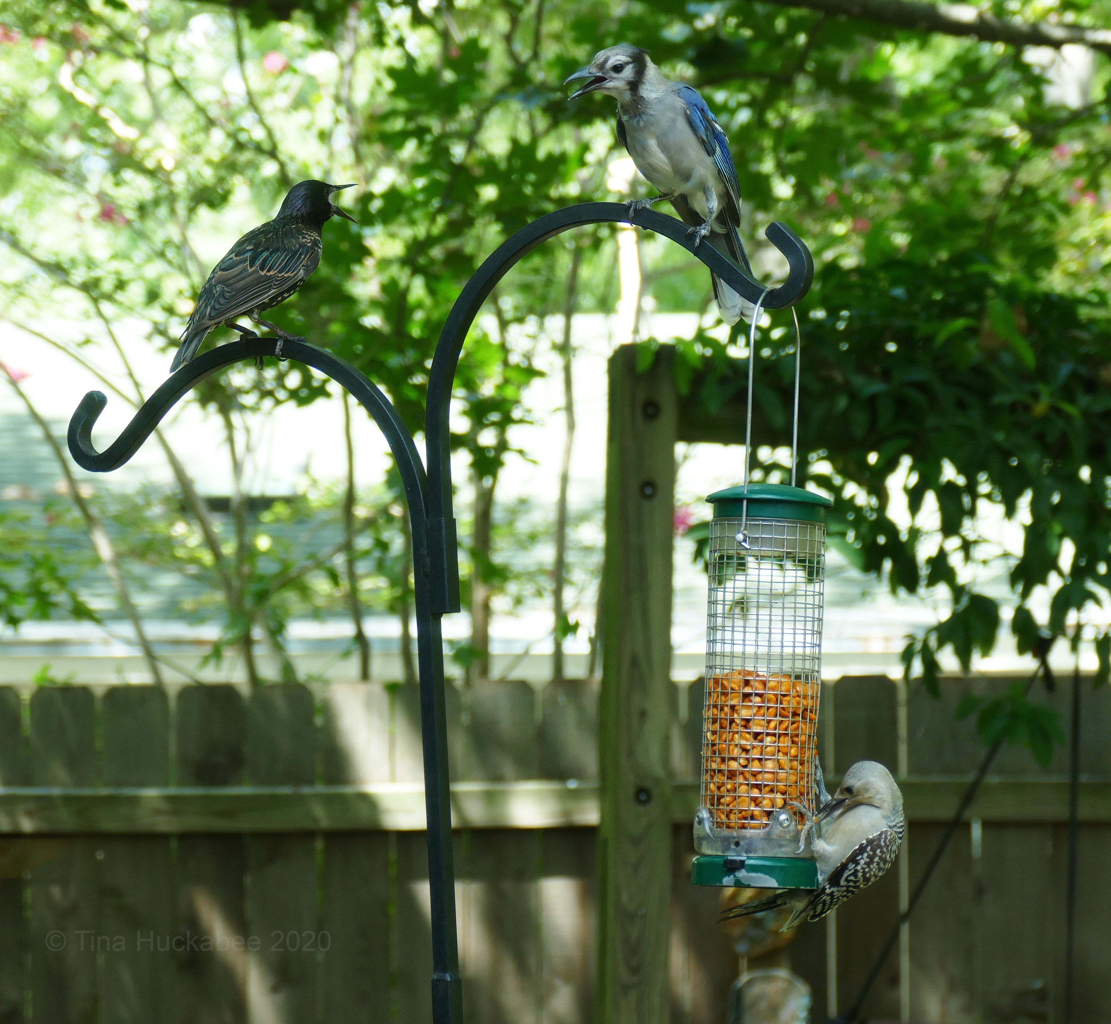 I guess this post could be renamed Stand Your Feeder but that doesn’t quite resonate. None of these birds are on the ground–standing or otherwise–one is eating at the feeder, the other two are waiting their turn. In this bit of bird drama, it’s the younger fledgling Red-bellied Woodpecker, Melanerpes carolinus, who’s in control, thwarting efforts to dislodge him and ignoring back chat from the the European Starling, Sturnus vulgaris, to the left, and the Blue Jay, Cyanocitta cristata, on top of the feeder stand. The Red-bellied is munching away at sought-after peanuts as the two adult birds caw and carp.